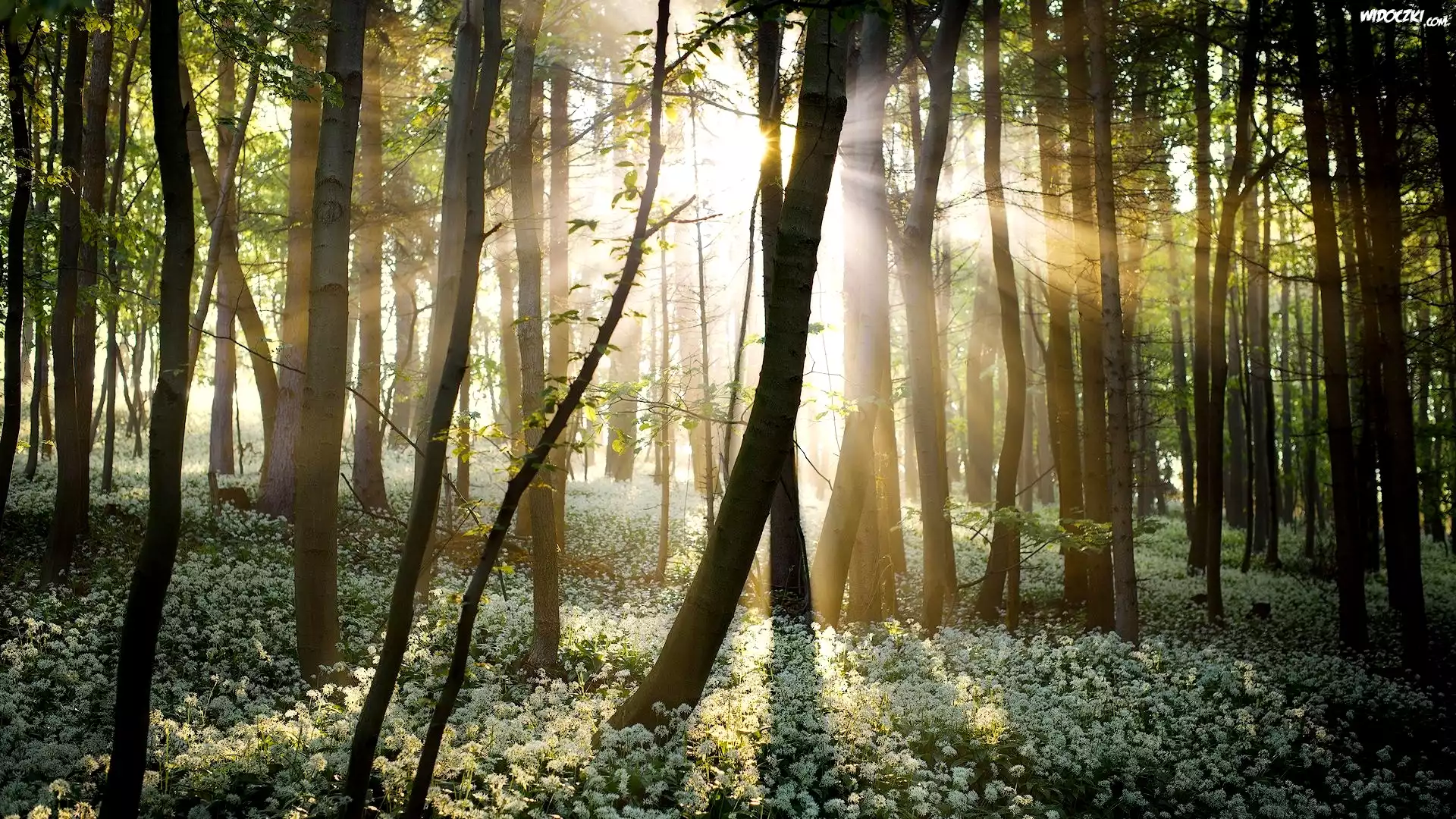 Las, Drzewa, Kwiaty, Czosnek niedźwiedzi, Promienie słońca