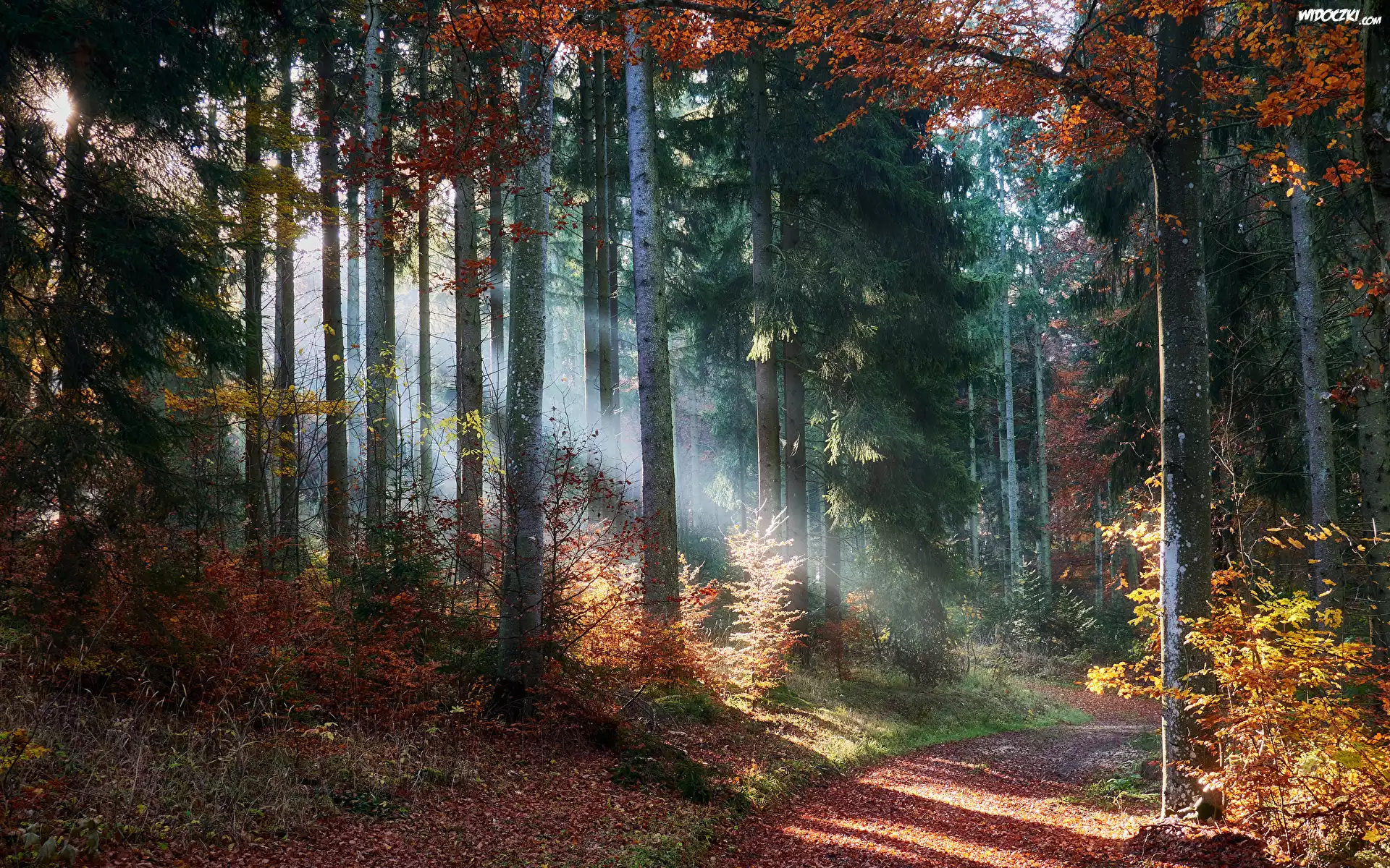 Zdjęcia, Las, Drzewa, Krzewy, Jesień, Ścieżka, Przebijające światło