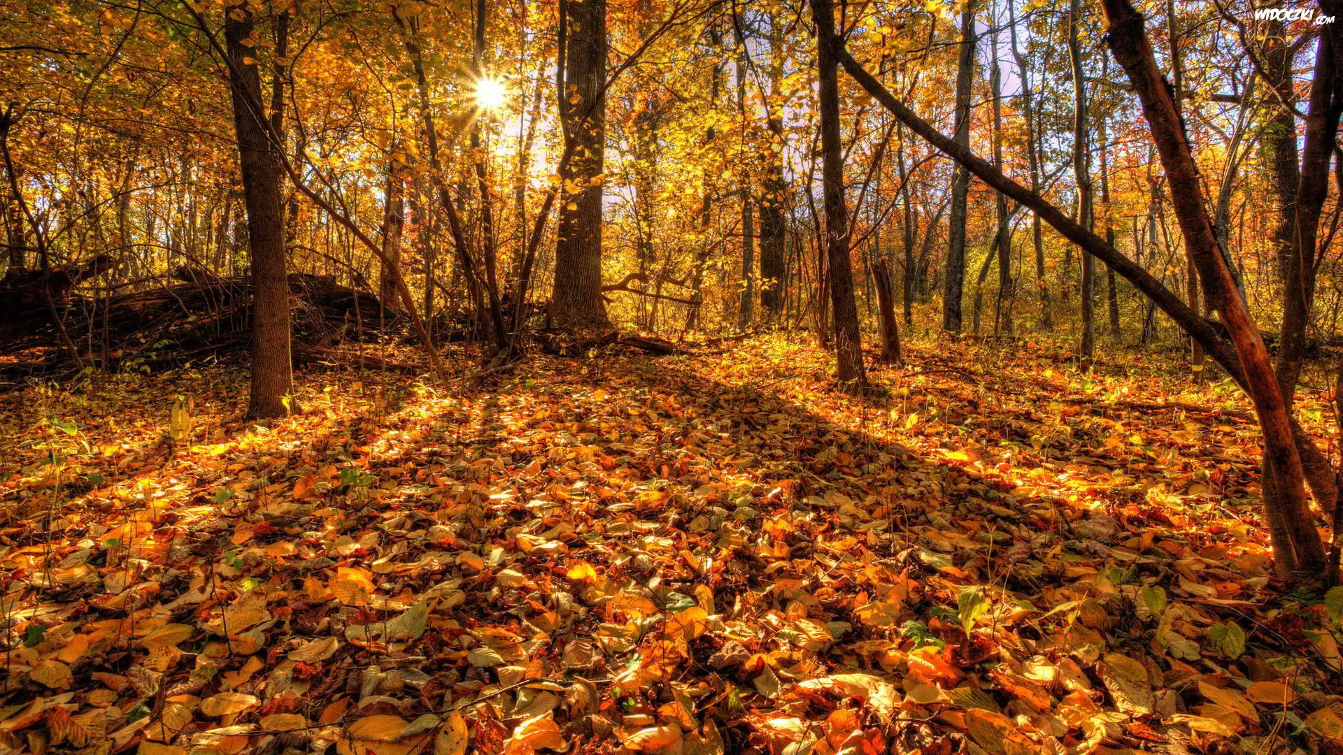 Zdjęcia, Las, Drzewa, Jesień, Pożółkłe, Liście, Przebijające światło