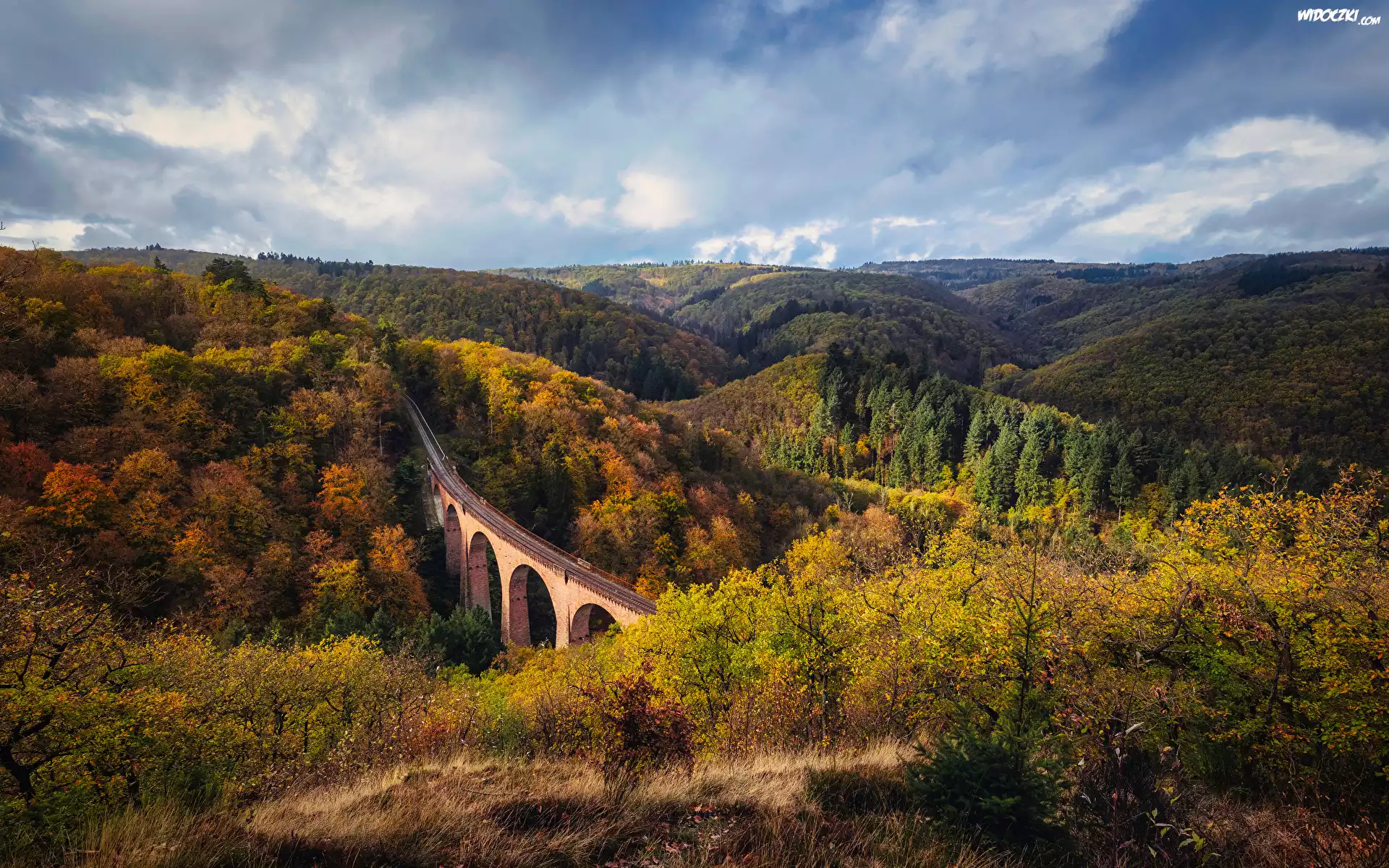 Jesień, Góry, Lasy, Drzewa, Most, Hubertusviadukt, Niemcy