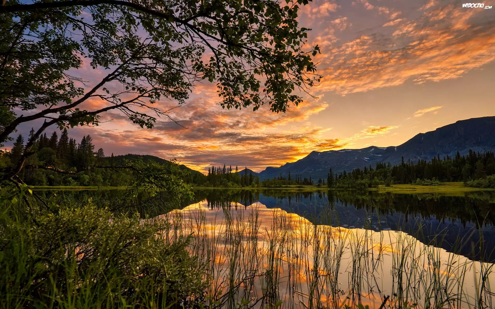 Góry, Jezioro, Lasy, Drzewa, Roślinność, Chmury, Odbicie