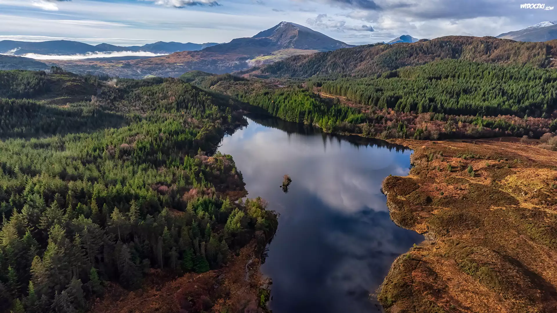 Zdjęcia, Wielka Brytania, Walia, Góry, Jezioro, Llyn Bodgynydd, Lasy, Drzewa, Z lotu ptaka