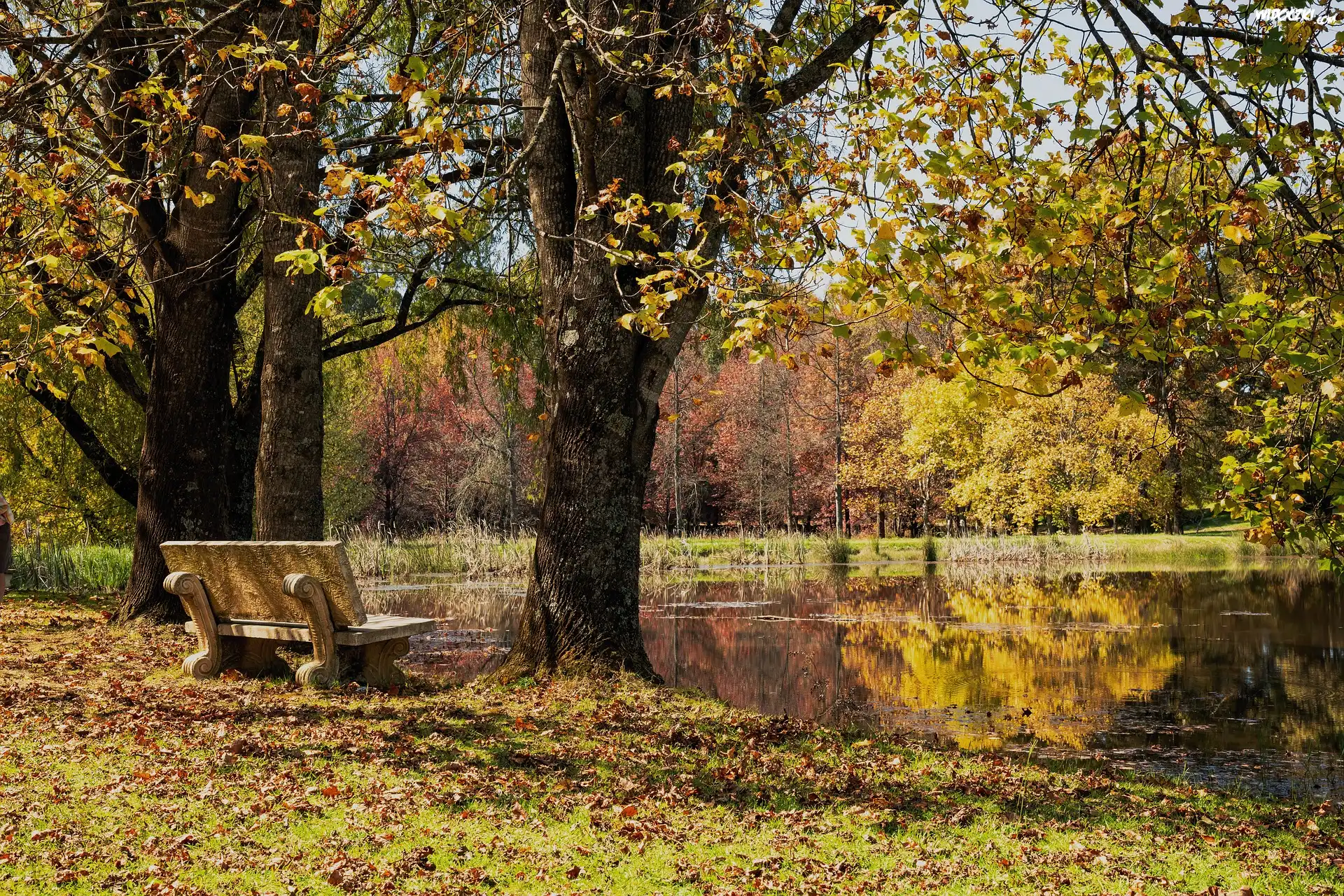 Jesień, Drzewa, Ławka, Staw, Park