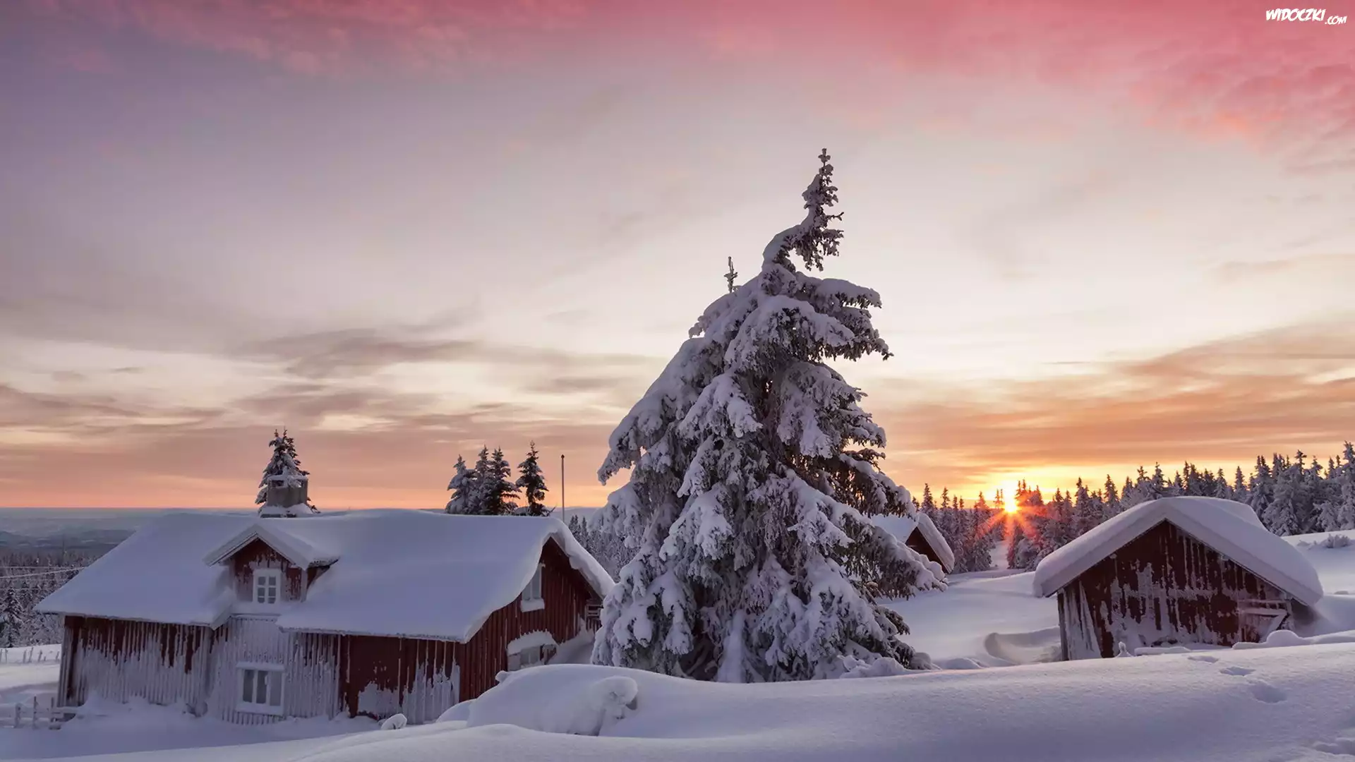 Norwegia, Gmina Lillehammer, Zima, Zachód słońca, Domy, Ośnieżone, Drzewa