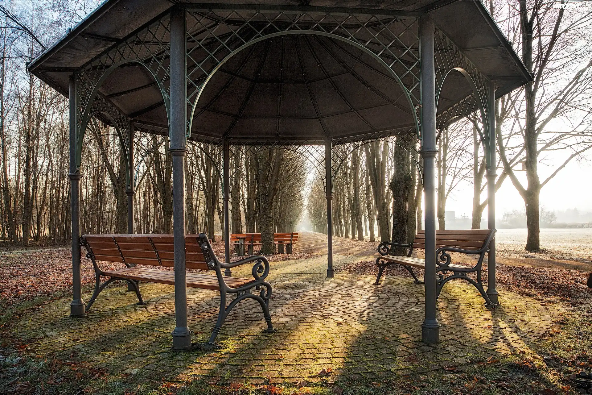 Zdjęcia, Drzewa, Słońce, Altana, Ławeczki, Liście, Droga