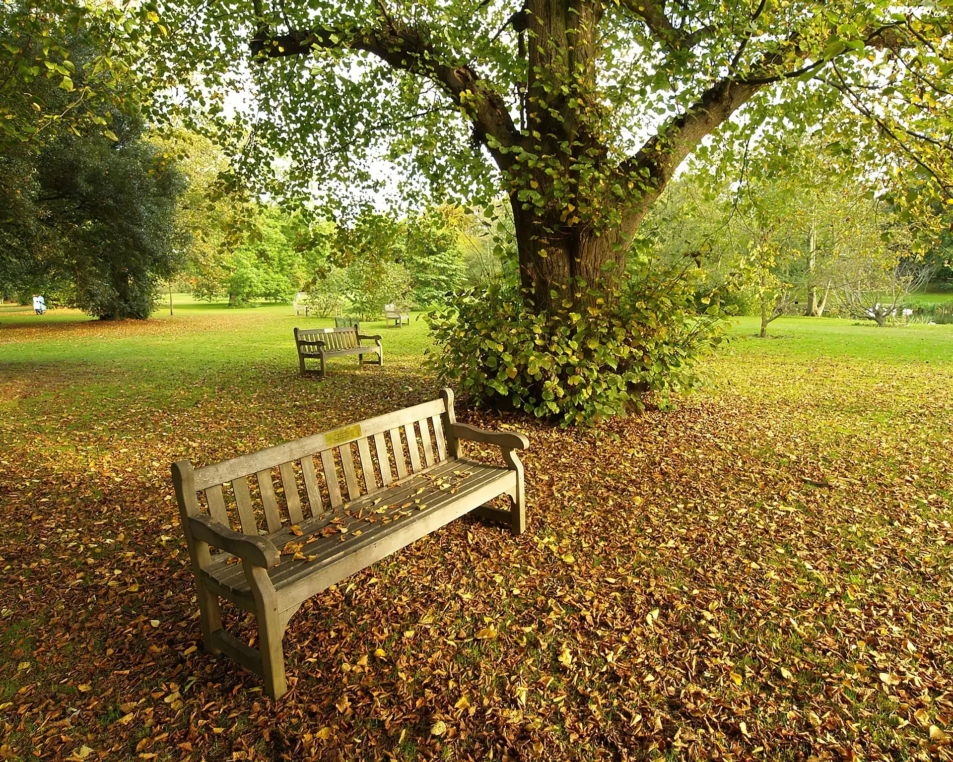 Zdjęcia, Ławki, Liście, Drzewa, Jesień