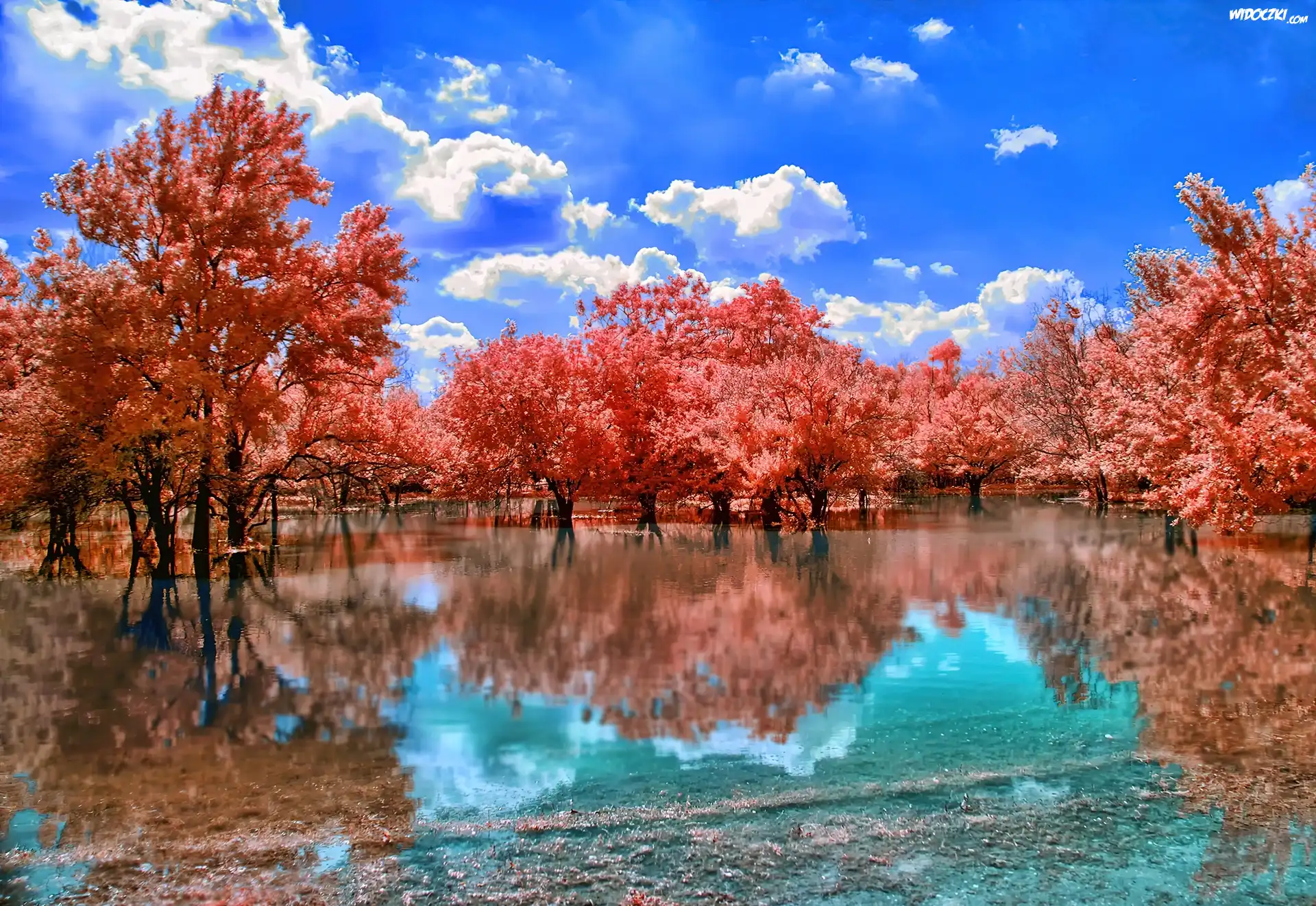 Zdjęcia, Drzewa, Czerwone, Liście, Jezioro