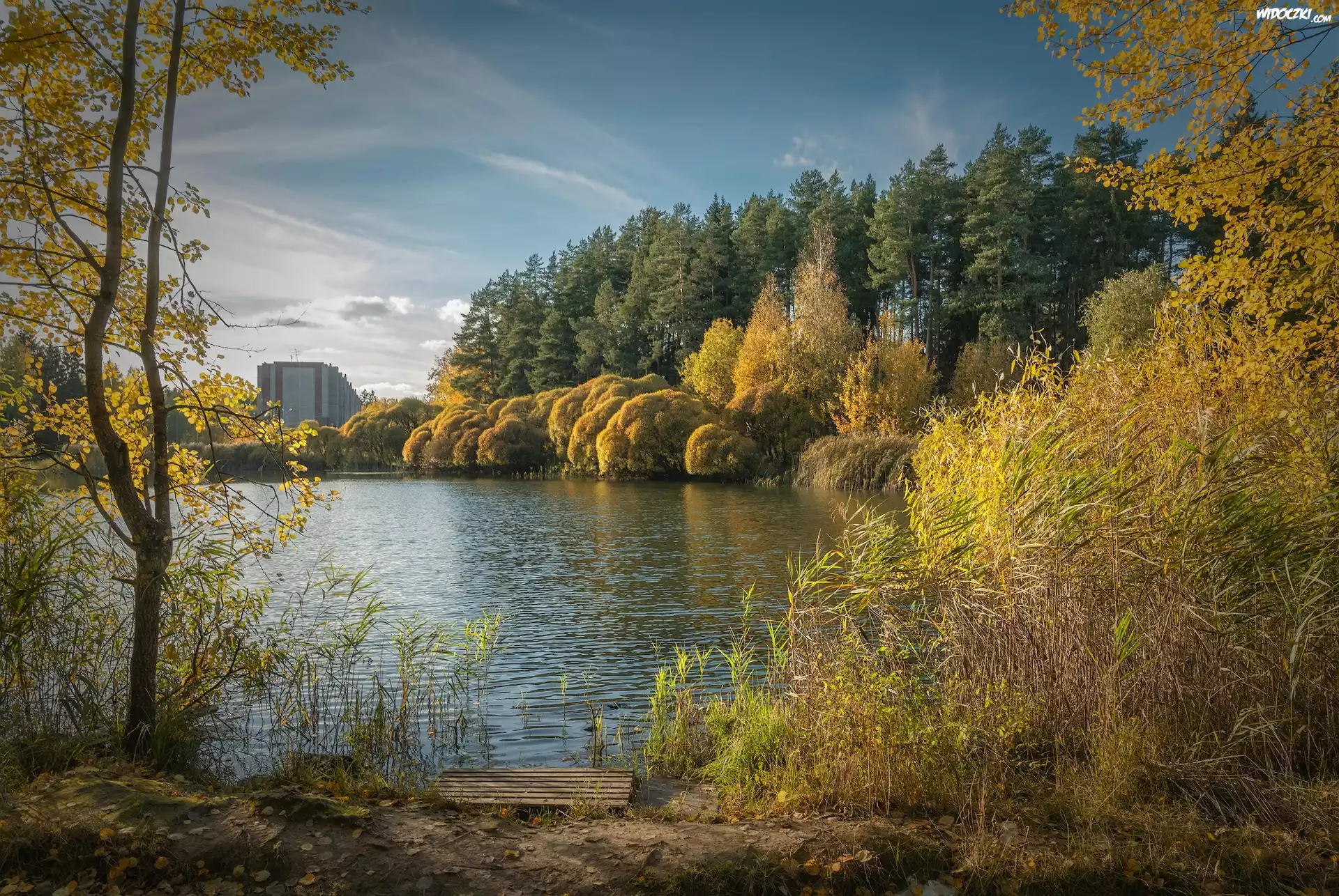 Zdjęcia, Jesień, Staw, Szuwary, Drzewa, Pożółkłe, Liście