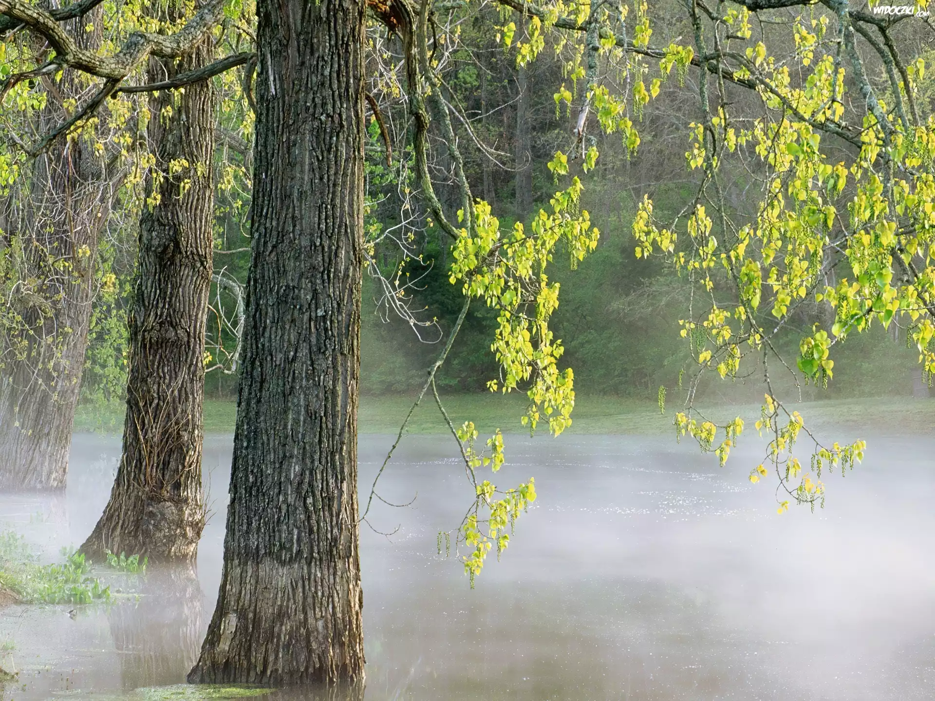 Zdjęcia, Drzewa, Zielone, Listki, Mgła