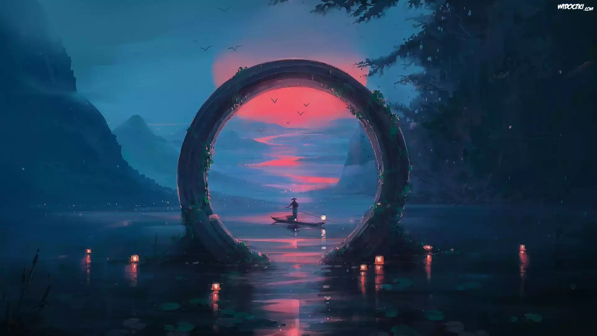 Grafika, Rzeka, Góry, Zachód słońca, Lampiony, Drzewa, Łódka, Postać, Okrągła, Brama