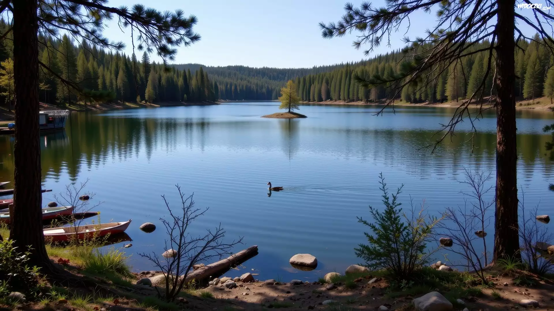 Jezioro, Drzewa, Łódki, Kamienie, Rośliny