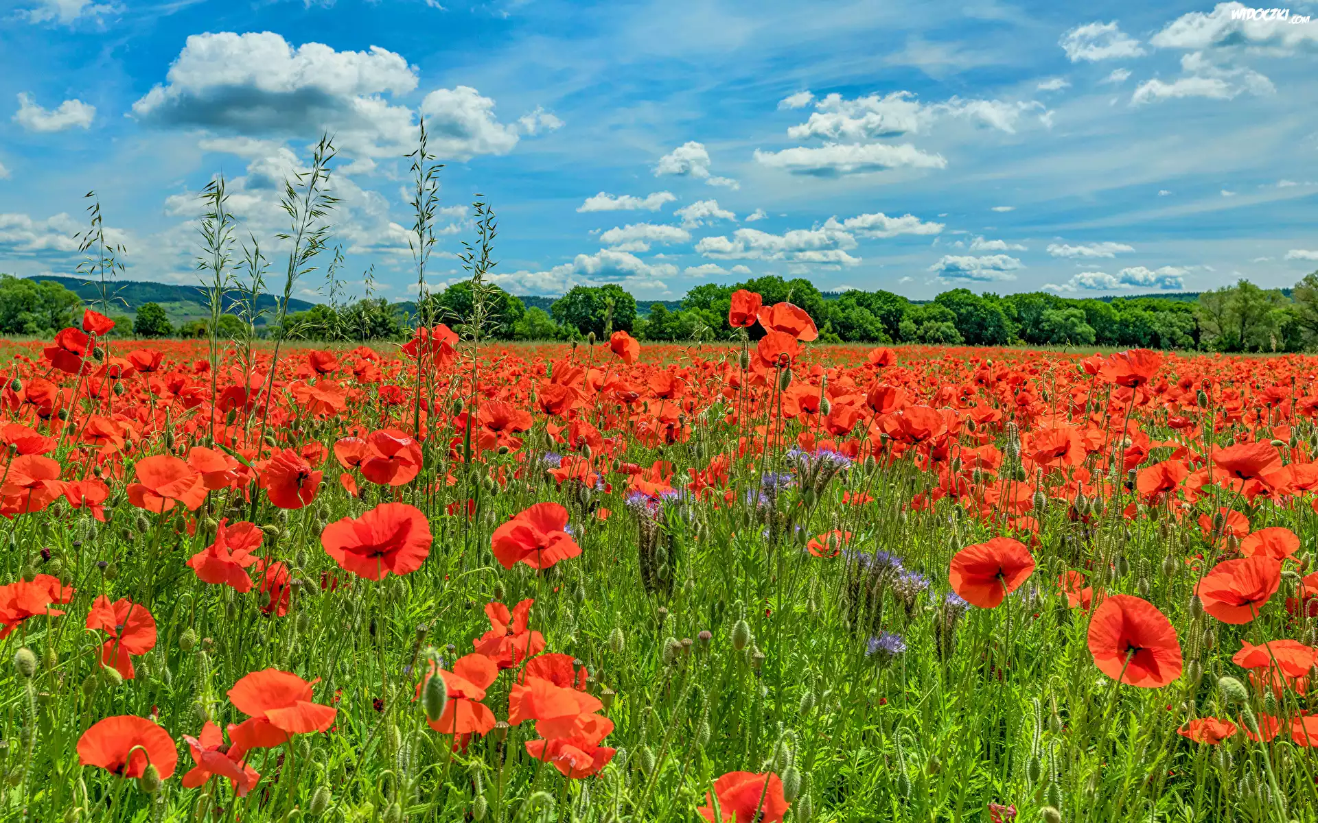 Zdjęcia, Łąka, Pole, Maki, Drzewa, Niebo, Białe, Chmury