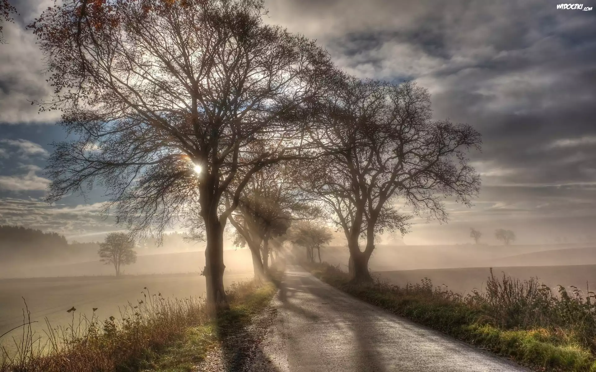 Zdjęcia, Drzewa, Droga, Mgła, Poranek