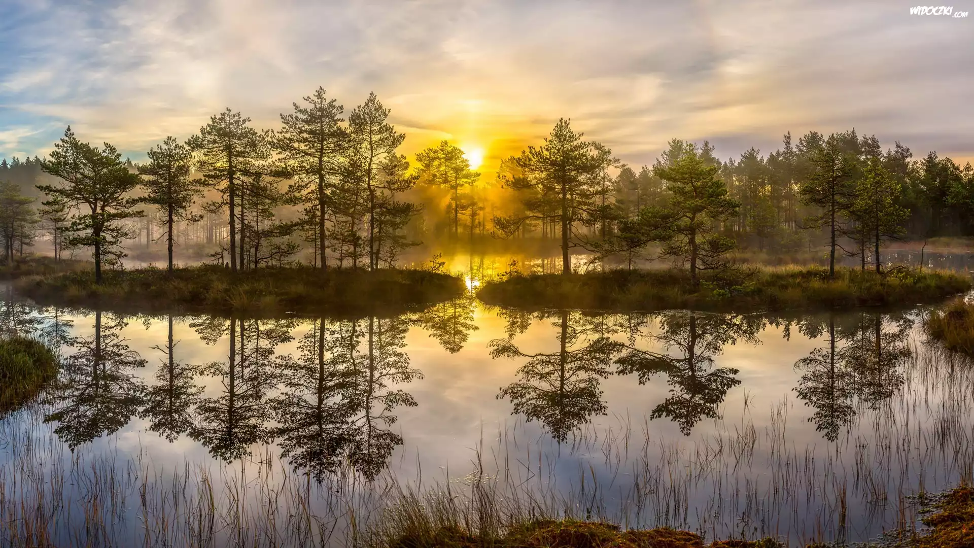 Zdjęcia, Jezioro, Drzewa, Odbicie, Trawa, Wschód słońca, Poranek, Mgła