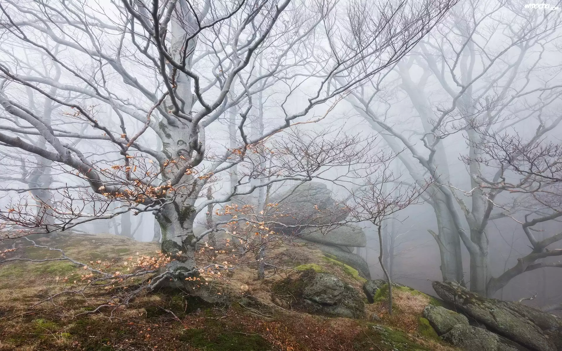 Zdjęcia, Skały, Drzewa, Mgła, Zamglony, Las
