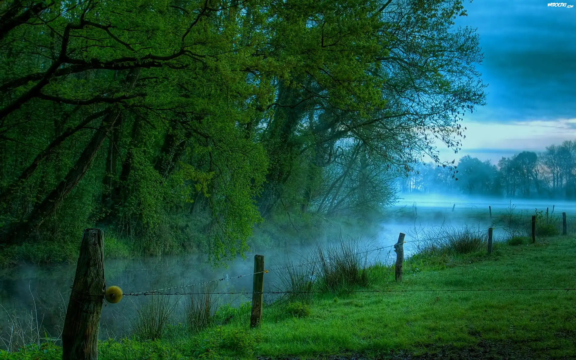 Zdjęcia, Drzewa, Ogrodzenie, Mgła, Łąka