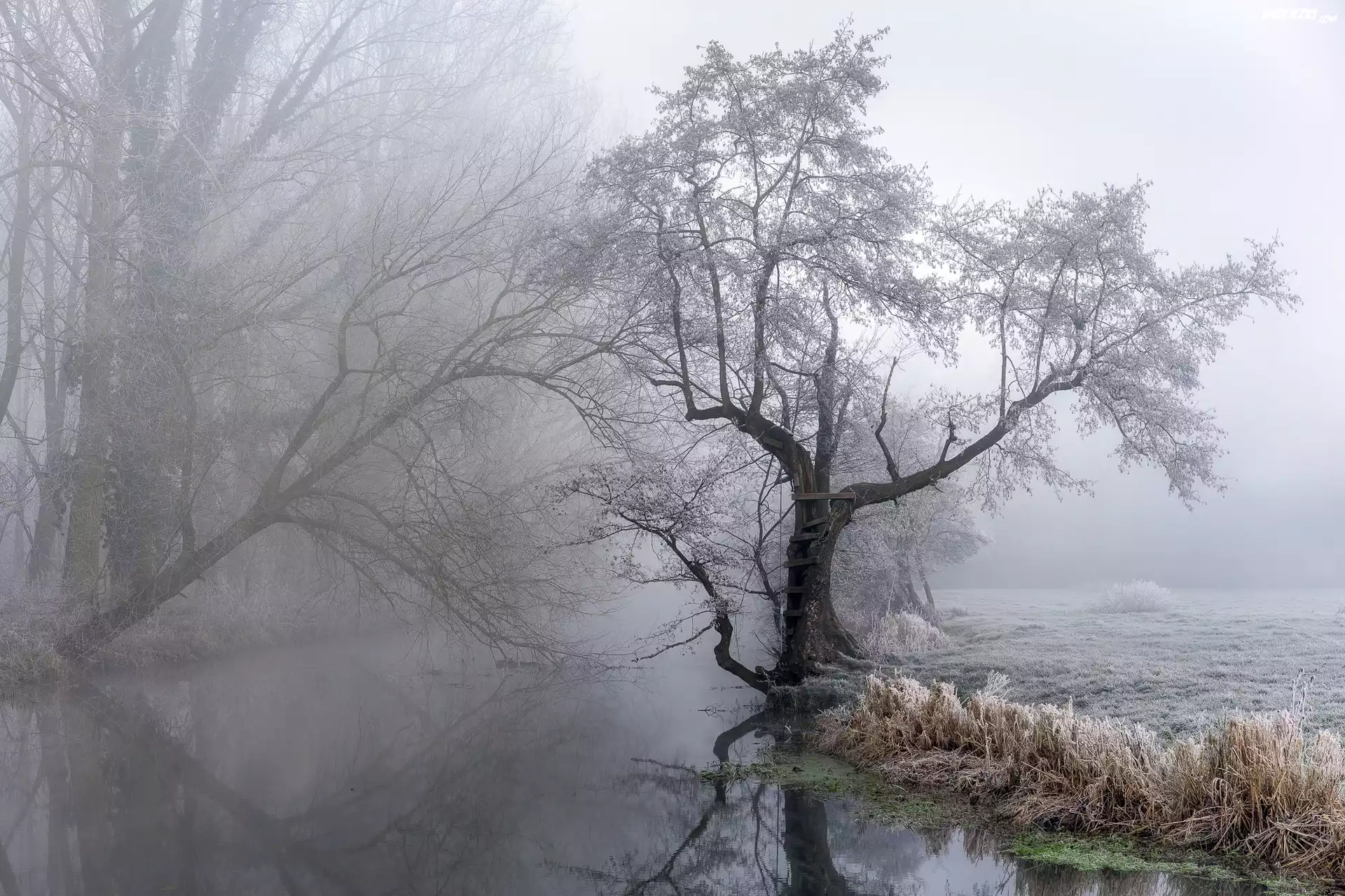 Drzewa, Rzeka, Szadź, Mgła, Pole