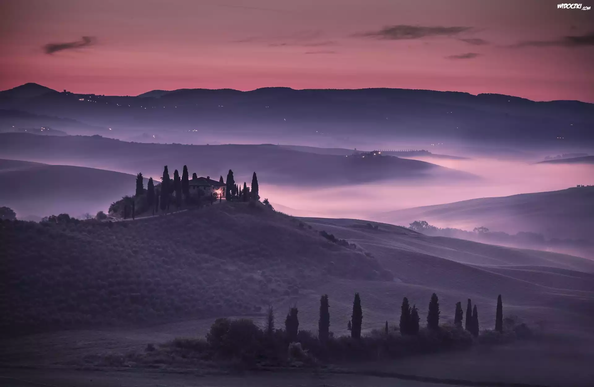 Zdjęcia, Mgła, Drzewa, Wzgórza