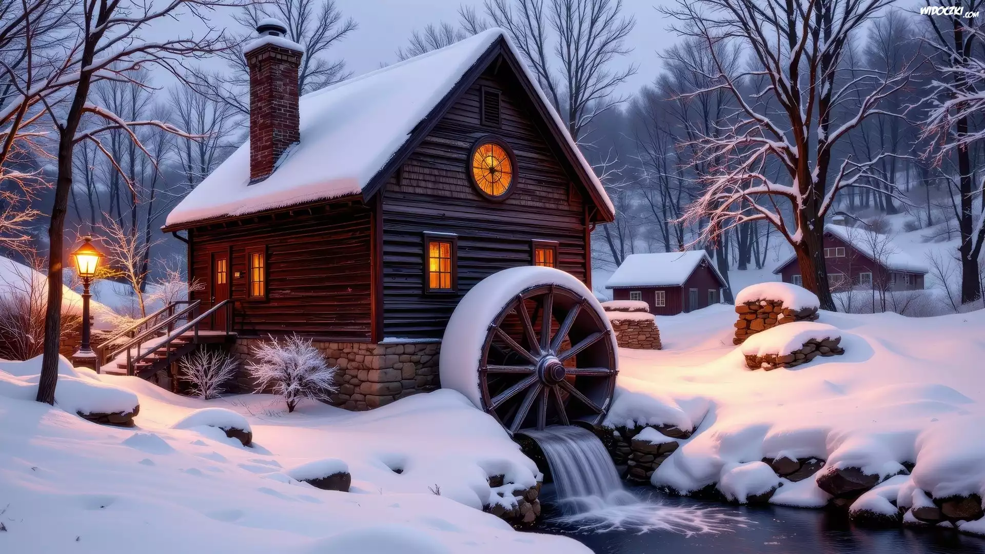 Zdjęcia, Zima, Śnieg, Młyn, Wodny, Domy, Rzeka, Latarnia, Drzewa