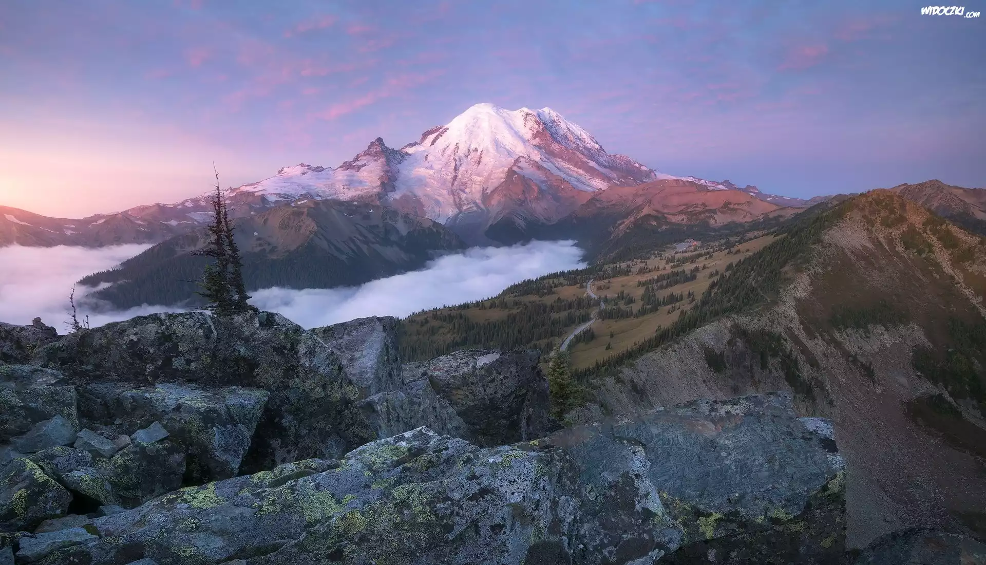 Góra, Mount Rainier, Park Narodowy Mount Rainier, Las, Drzewa, Mgła, Stan Waszyngton, Stany Zjednoczone |