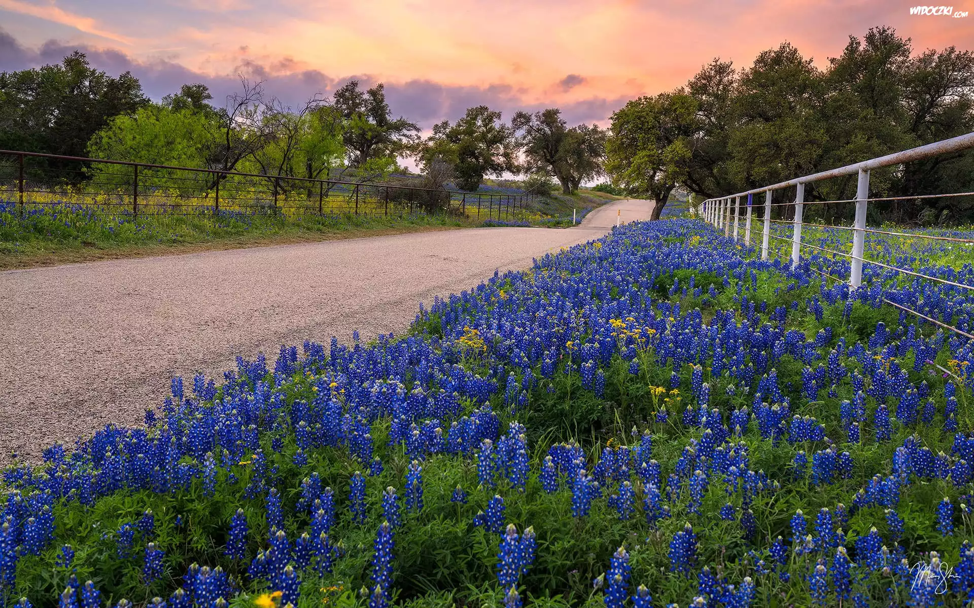 Zdjęcia, Droga, Drzewa, Niebieskie, Kwiaty, Łubin