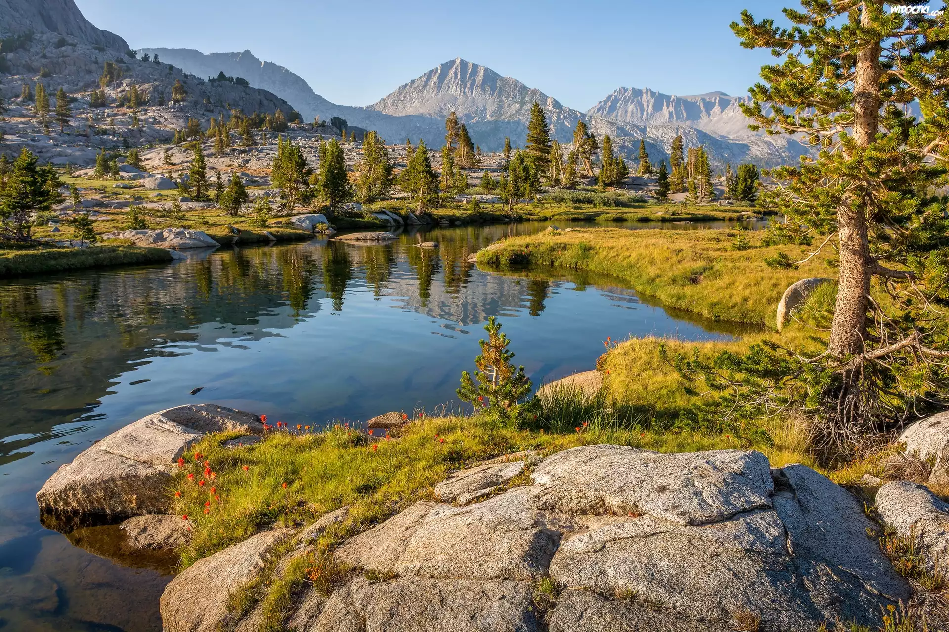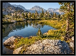 Zdjęcia, Góry, Skały, Jezioro, Drzewa, Kamienie, Niebo