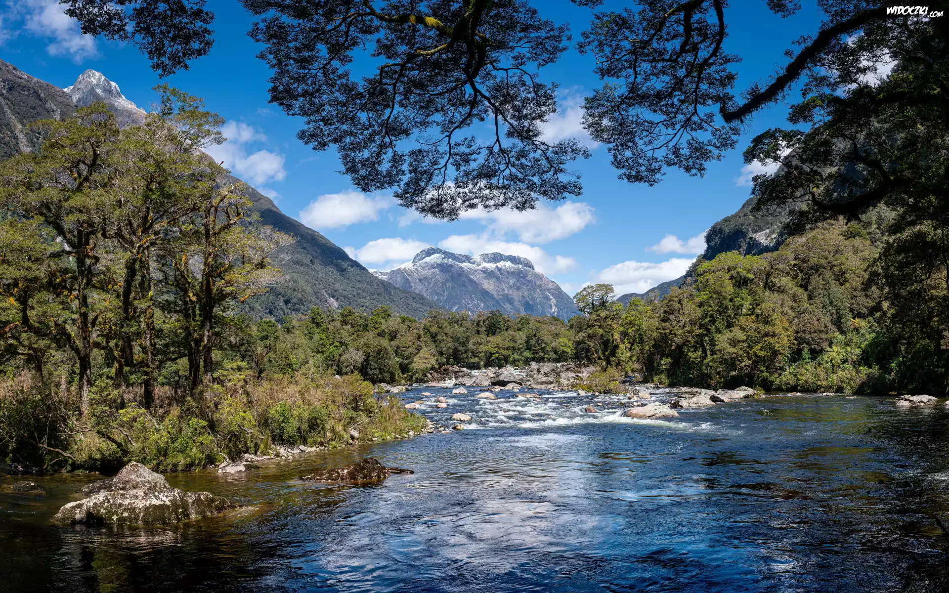 Góry, Rzeka, Kamienie, Drzewa, Gałęzie, Niebo