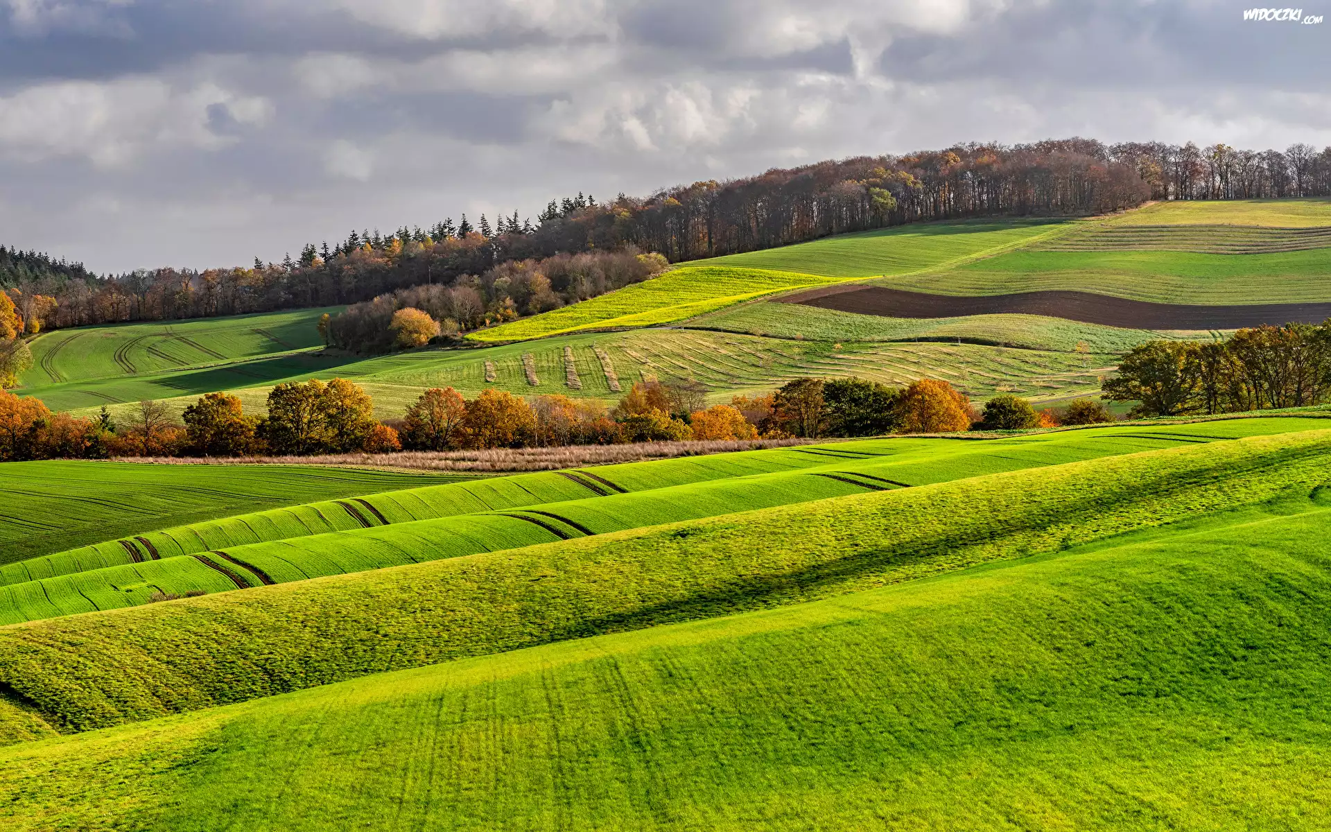 Zdjęcia, Wzgórza, Pola, Uprawne, Drzewa, Las, Niebo