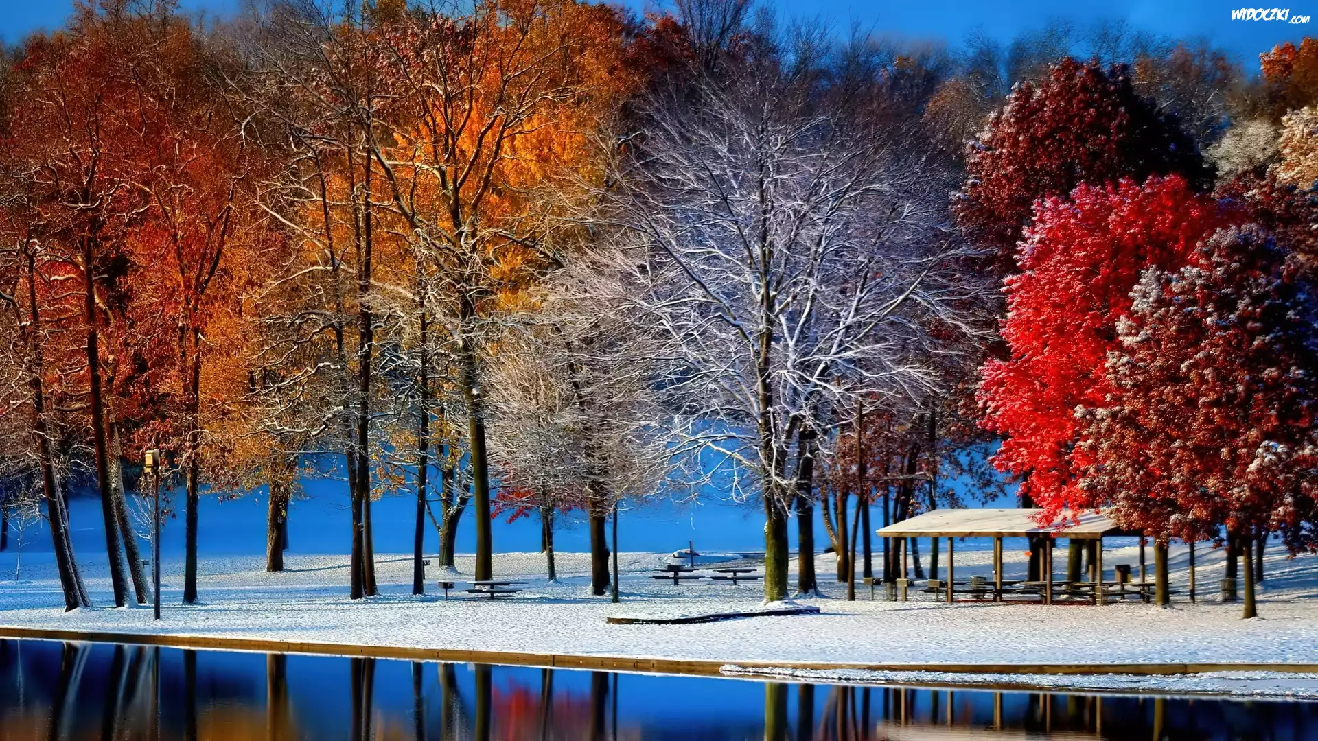Zdjęcia, Drzewa, Park, Śnieg, Jezioro