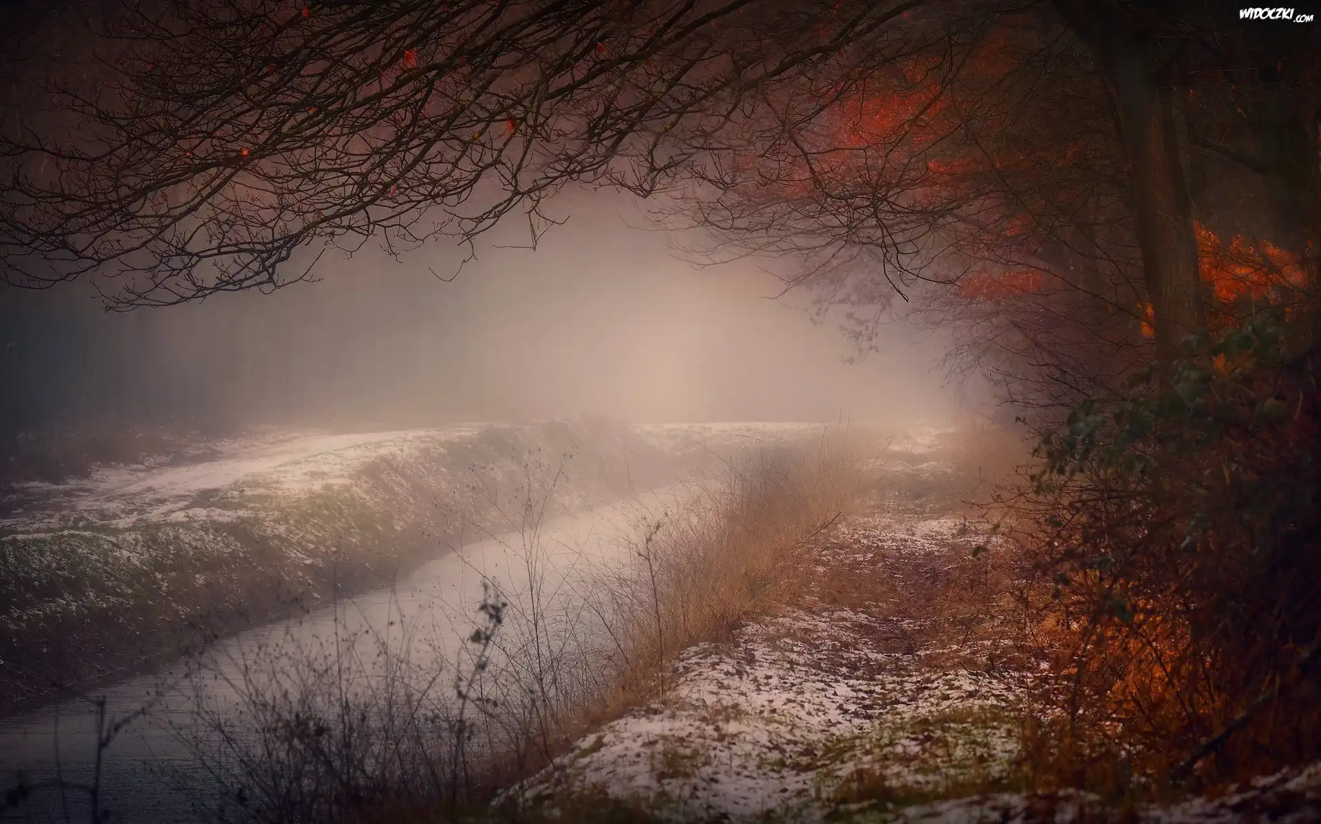 Drzewa, Jesień, Rzeka, Śnieg, Mgła