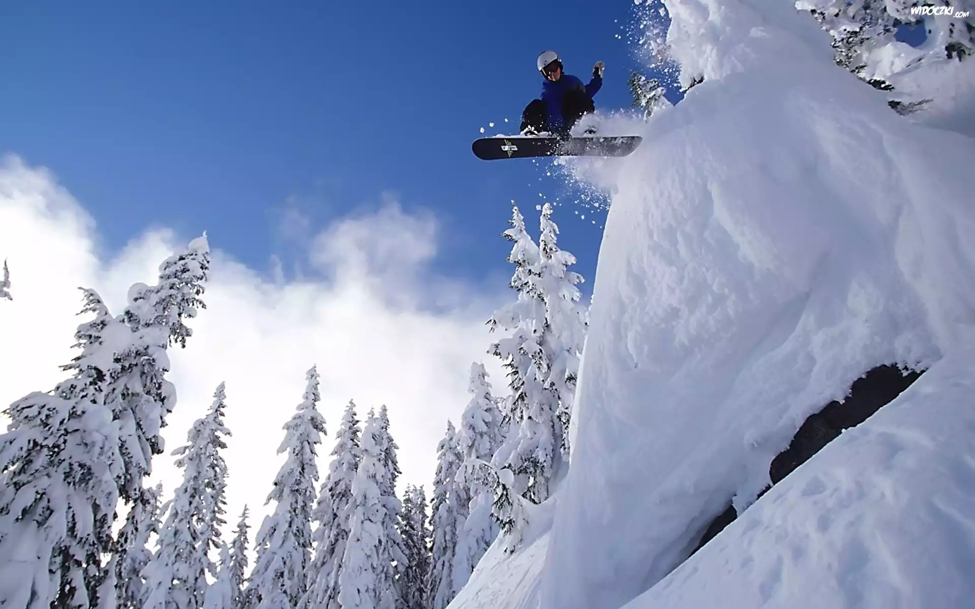 Zdjęcia, Śnieg, Drzewa, Snowboard