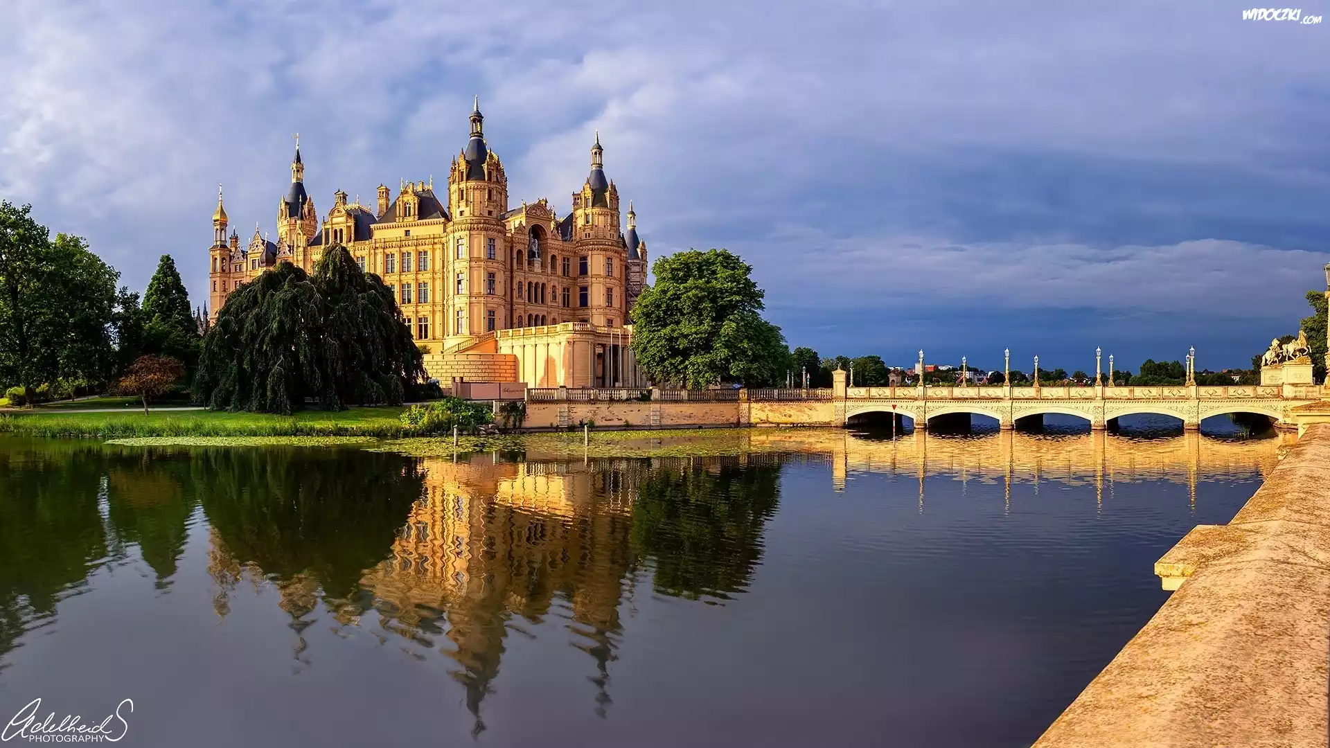 Zdjęcia, Zamek, Rzeka, Most, Drzewa, Schwerin, Niemcy