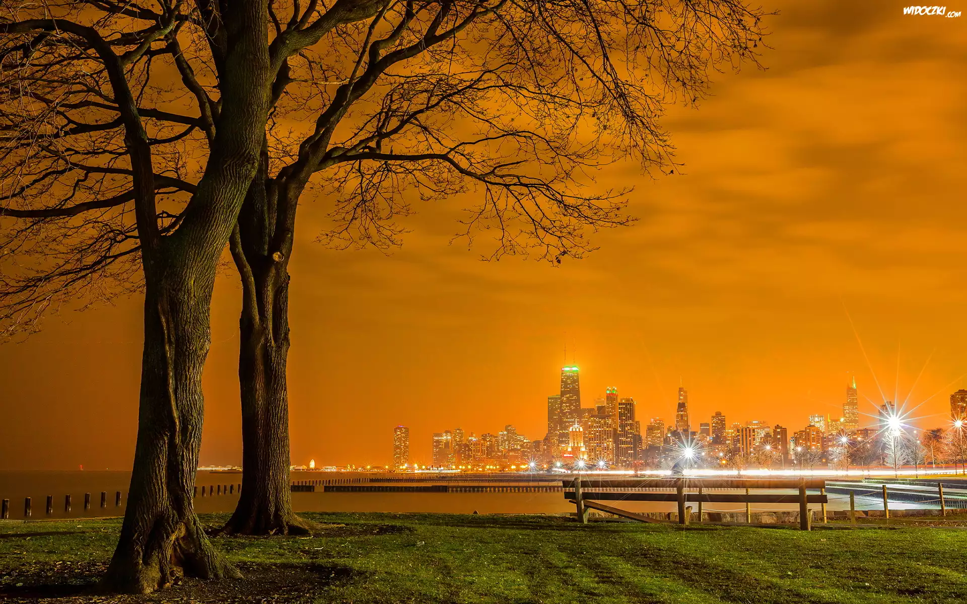 Zdjęcia, Drzewa, Ławeczka, Miasto, Noc, Światła