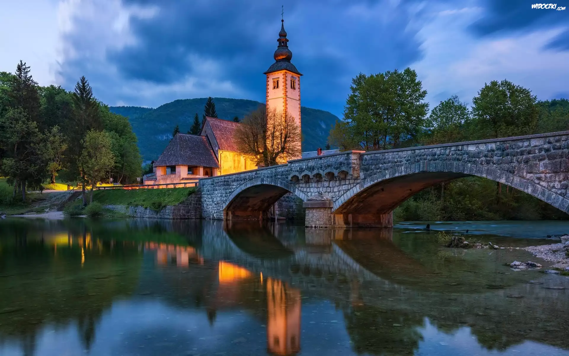 Zdjęcia, Most, Jezioro Bohinj, Kościół św Jana, Drzewa, Odbicie, Gmina Bohinj, Słowenia