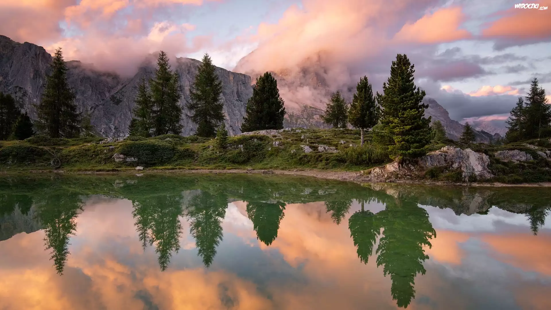 Zdjęcia, Góry, Jezioro, Chmury, Drzewa, Skały, Odbicie