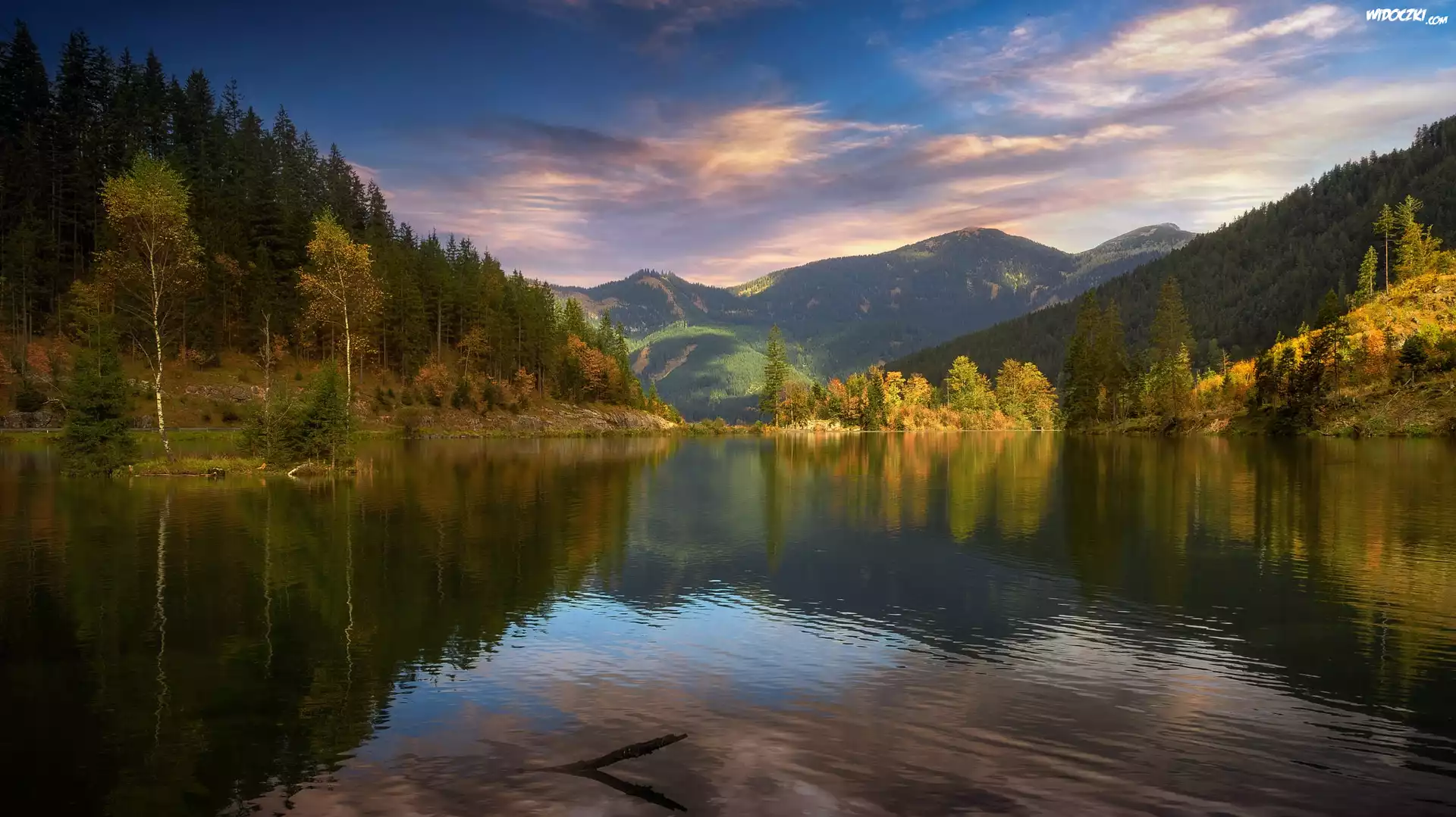 Góry, Jezioro, Odbicie, Drzewa, Las, Niebo, Jesień