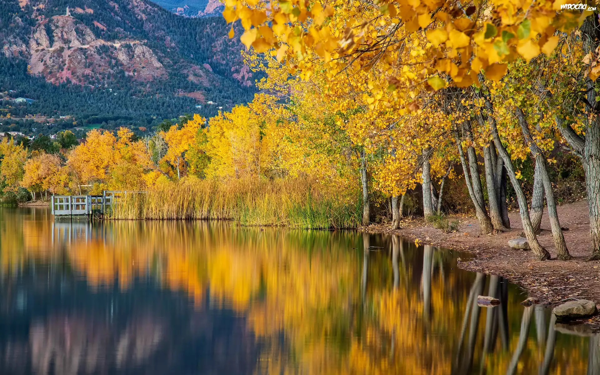 Góry, Jezioro, Las, Drzewa, Jesień, Odbicie