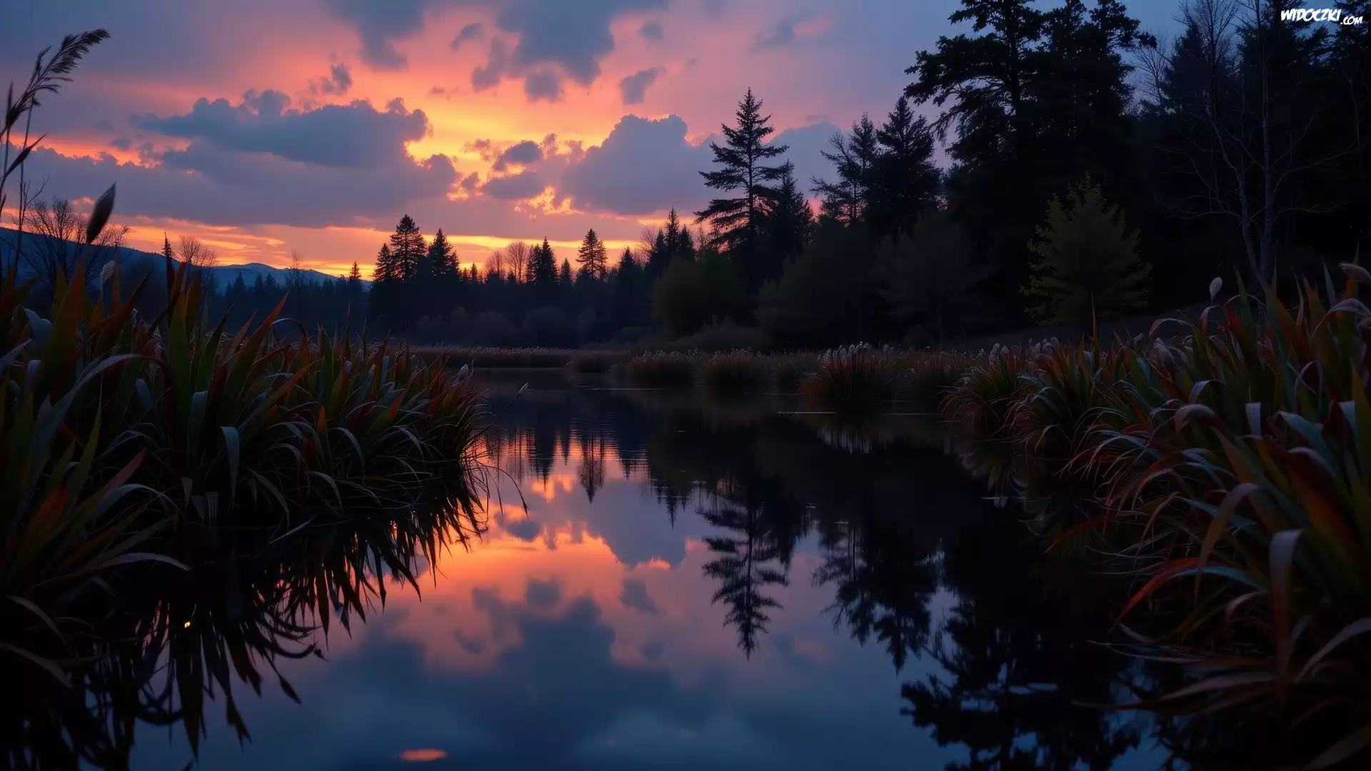 Kolorowe, Niebo, Staw, Drzewa, Rośliny, Odbicie