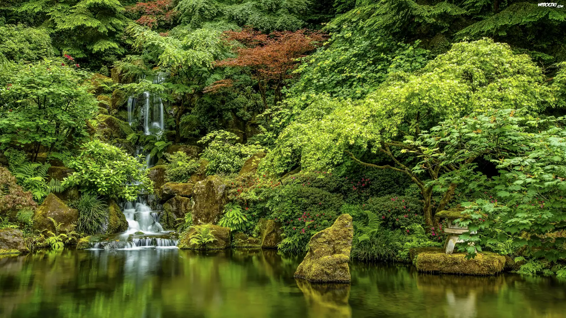 Drzewa, Krzewy, Wodospad, Kamienie, Ogród, Park