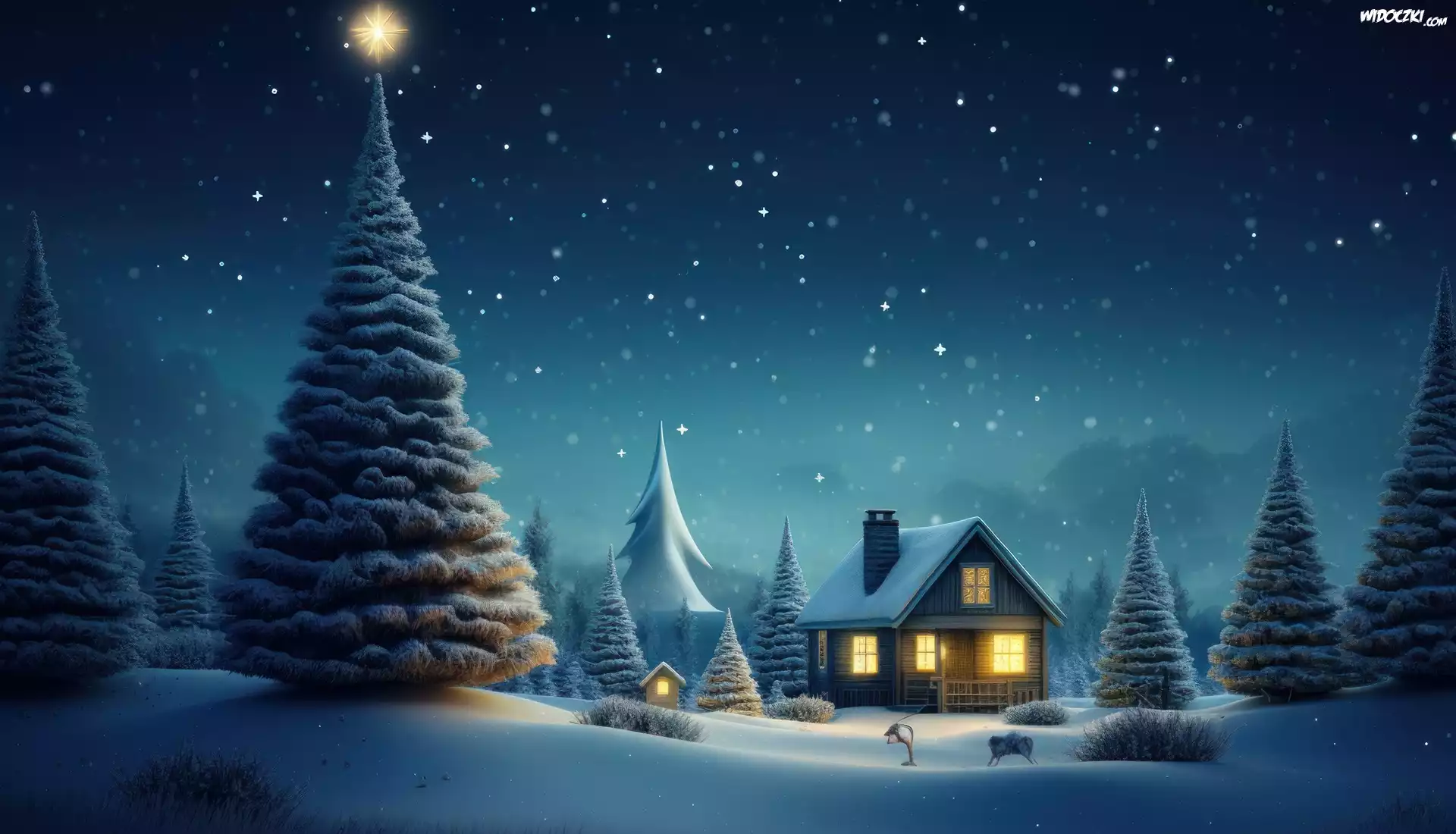 Zdjęcia, Zima, Dom, Ośnieżone, Drzewa, Gwiaździste, Niebo, Grafika