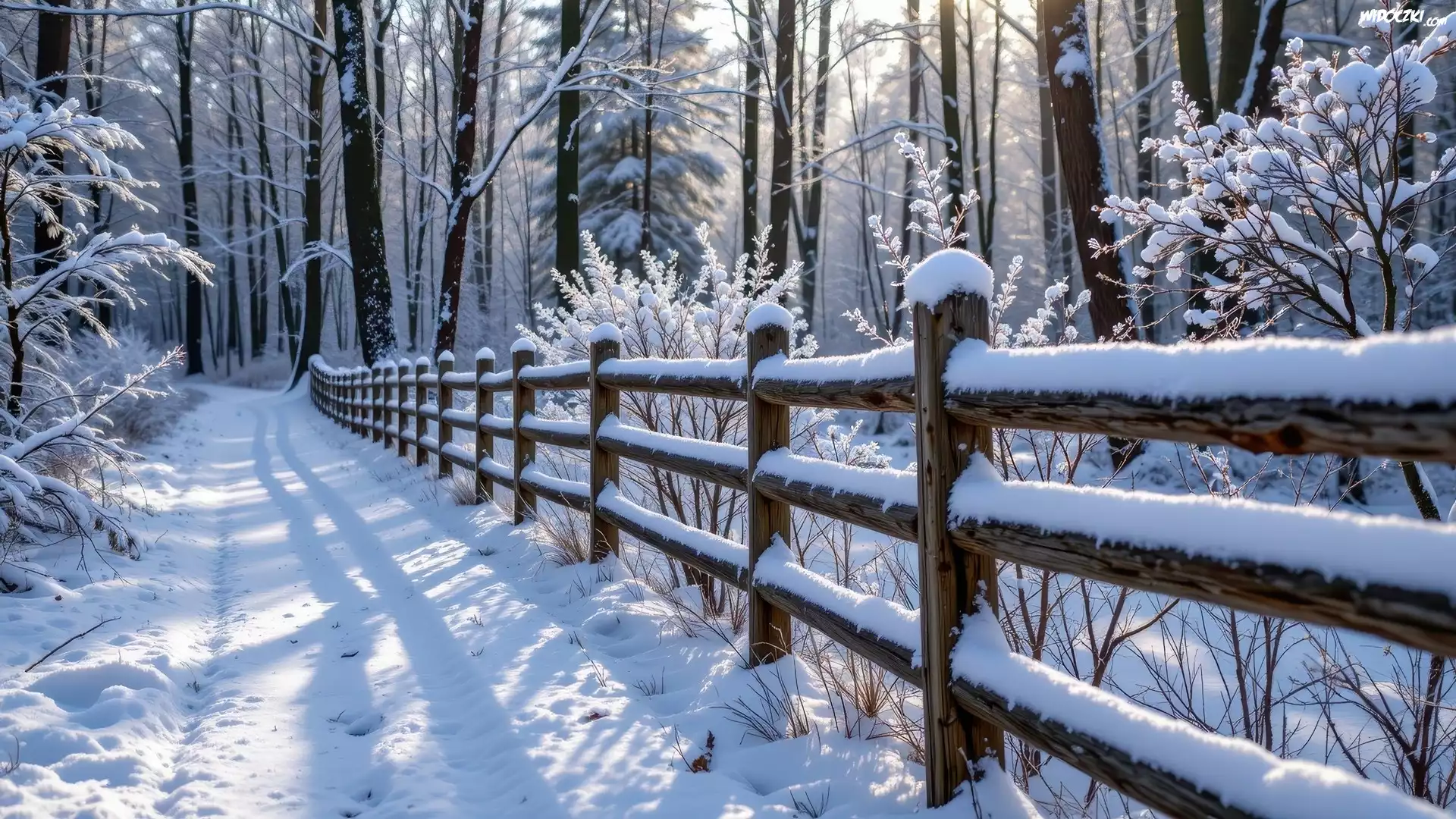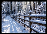Zdjęcia, Zima, Las, Ośnieżone, Drzewa, Zaśnieżona, Droga, Ogrodzenie