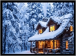 Zdjęcia, Zima, Las, Ośnieżone, Drzewa, Oświetlony, Dom, Śnieg