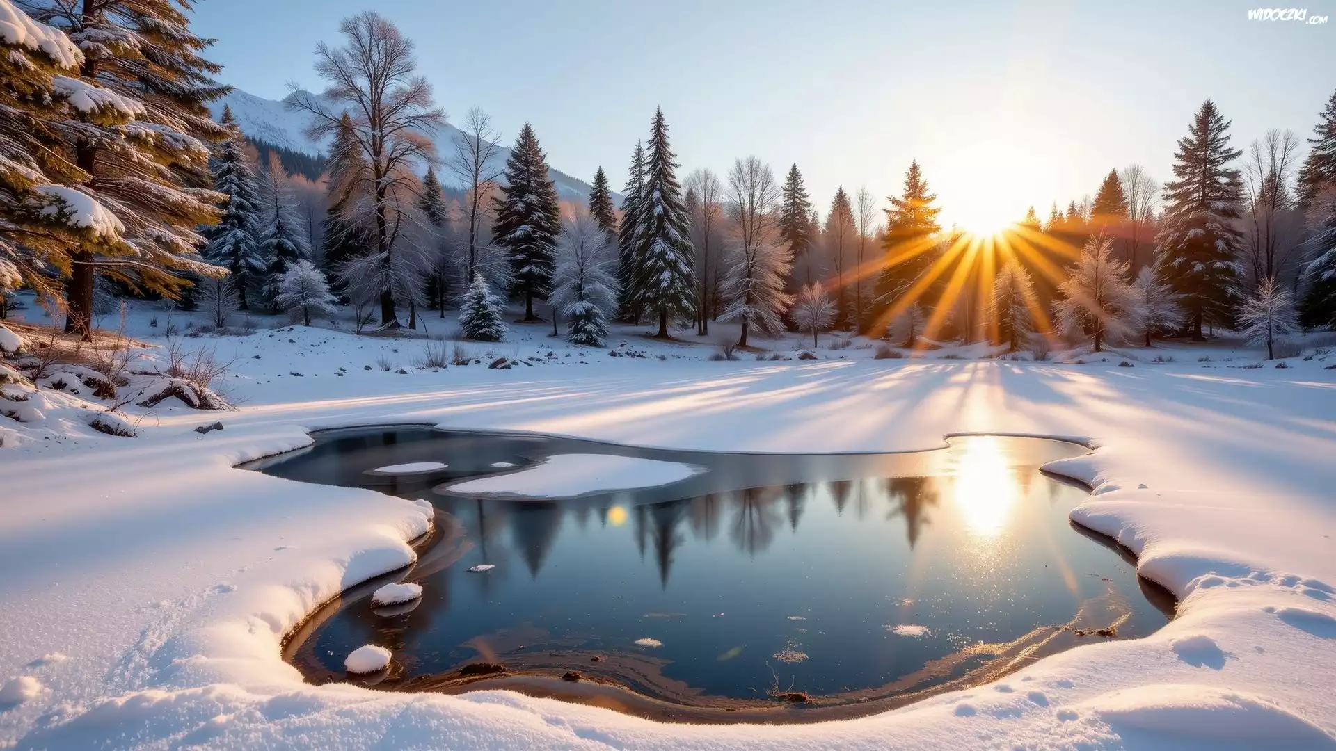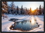 Zdjęcia, Zima, Śnieg, Ośnieżone, Drzewa, Promienie słońca, Jezioro