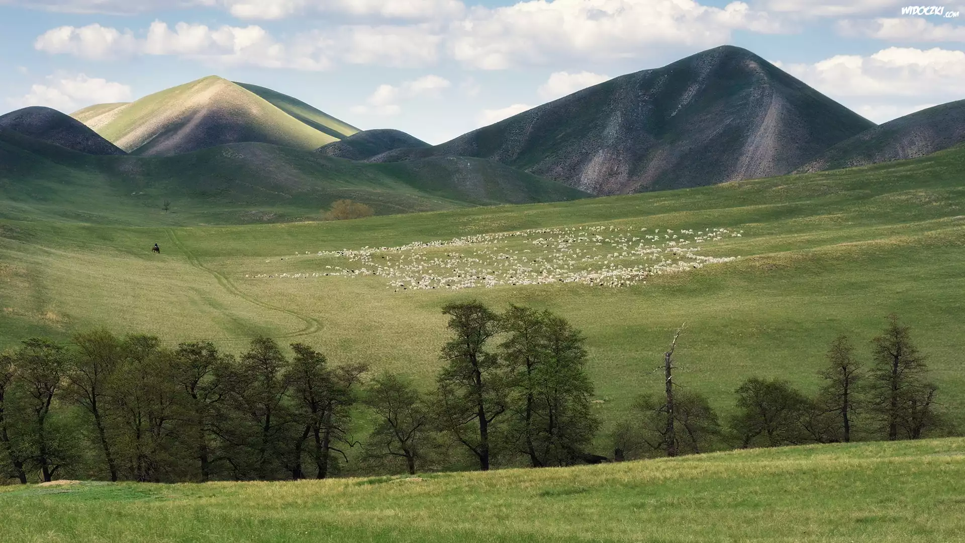 Zdjęcia, Łąka, Owce, Drzewa, Góry
