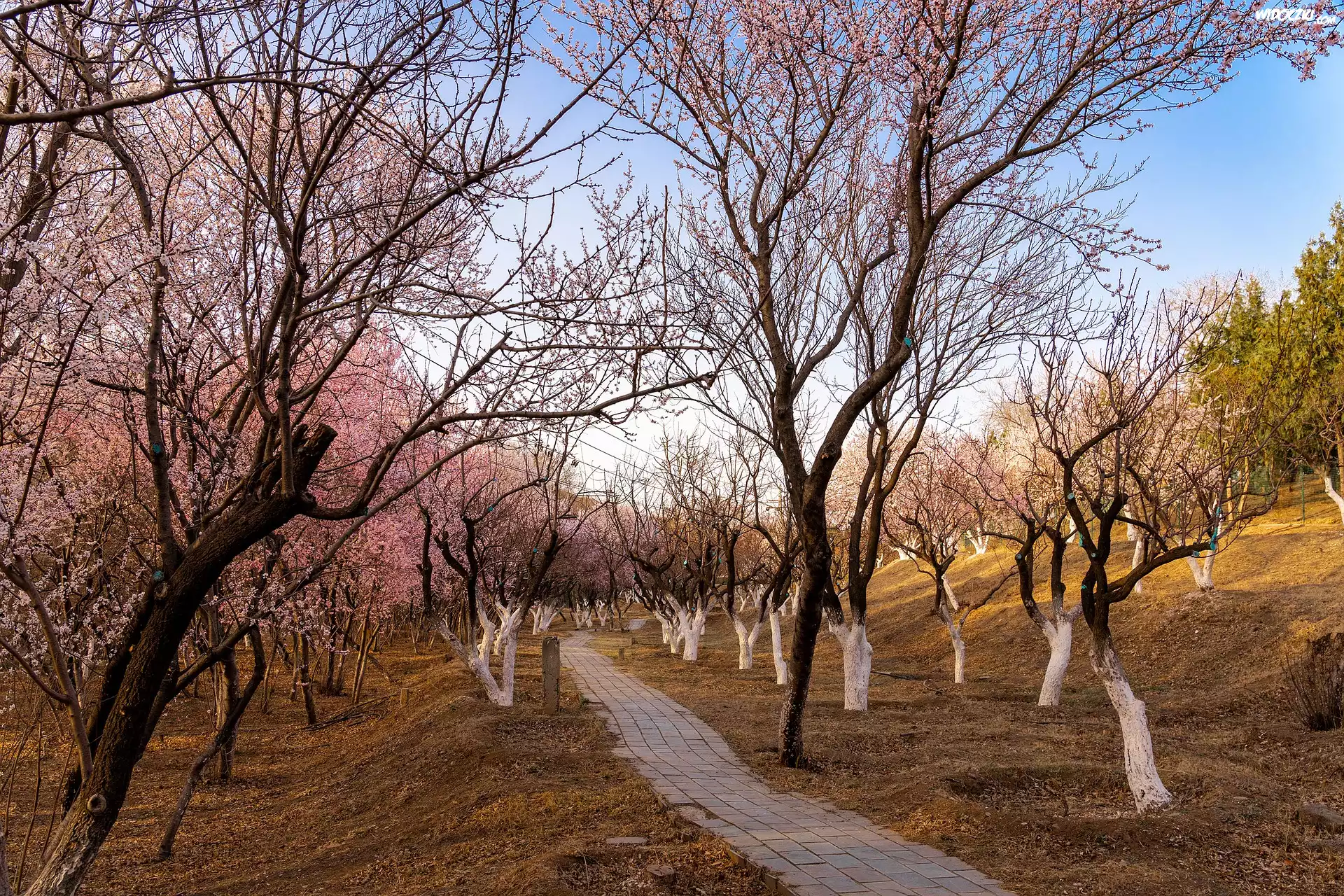 Zdjęcia, Wiosna, Drzewa owocowe, Ścieżka, Park
