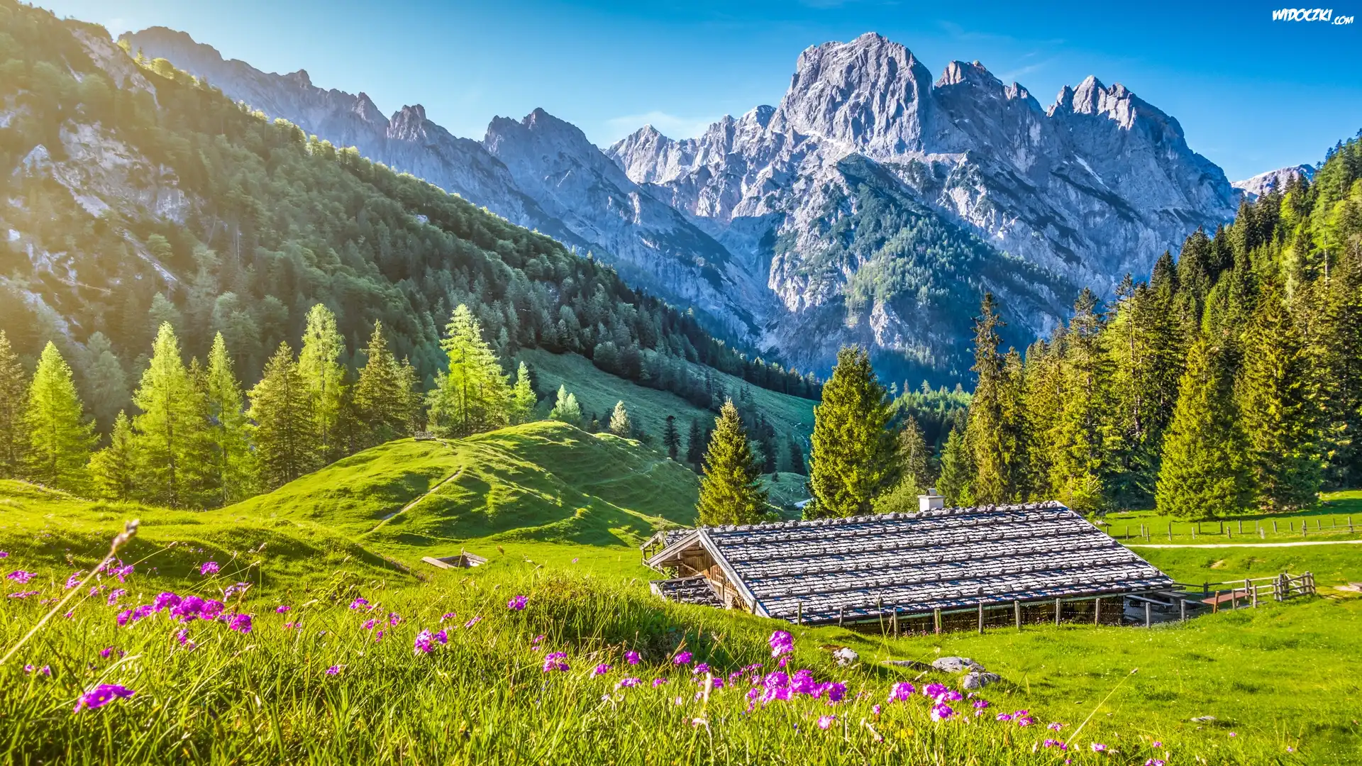 Zdjęcia, Niemcy, Bawaria, Góry Alpy, Park Narodowy Berchtesgaden, Drewniany, Budynek, Drzewa