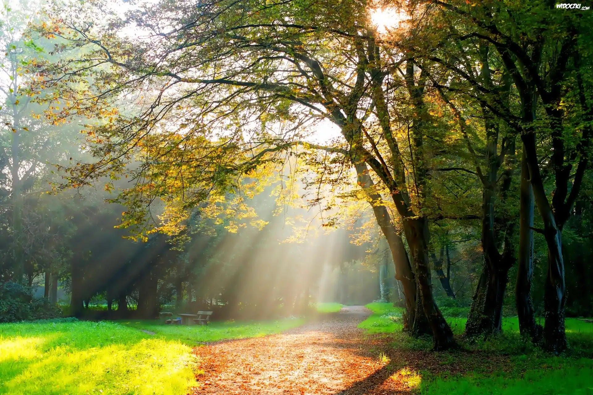 Park, Drzewa, Alejki, Ławki, Promienie, Słońca, Jesiennie