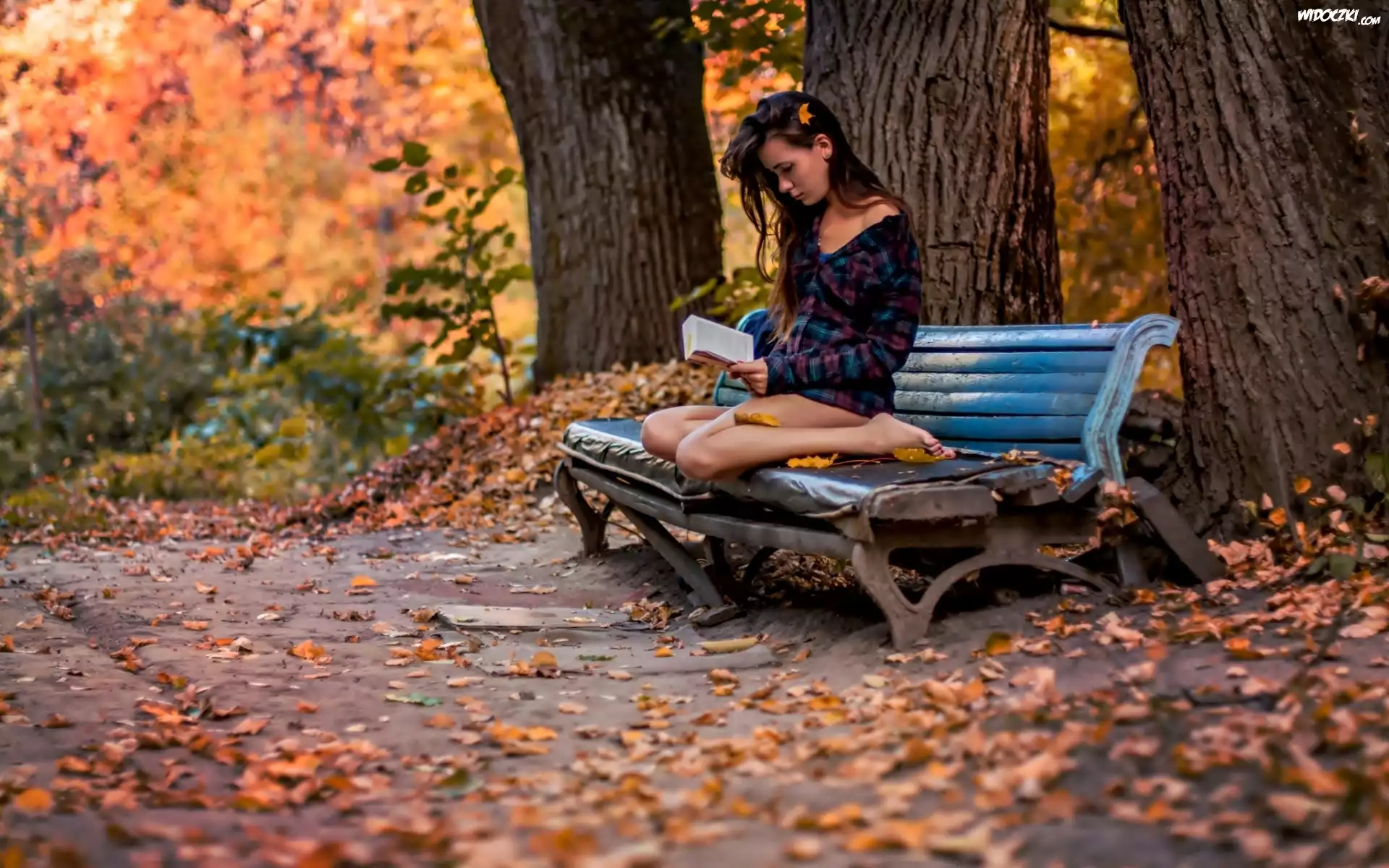 Zdjęcia, Park, Drzewa, Liście, Jesień, Ławka, Kobieta, Książka