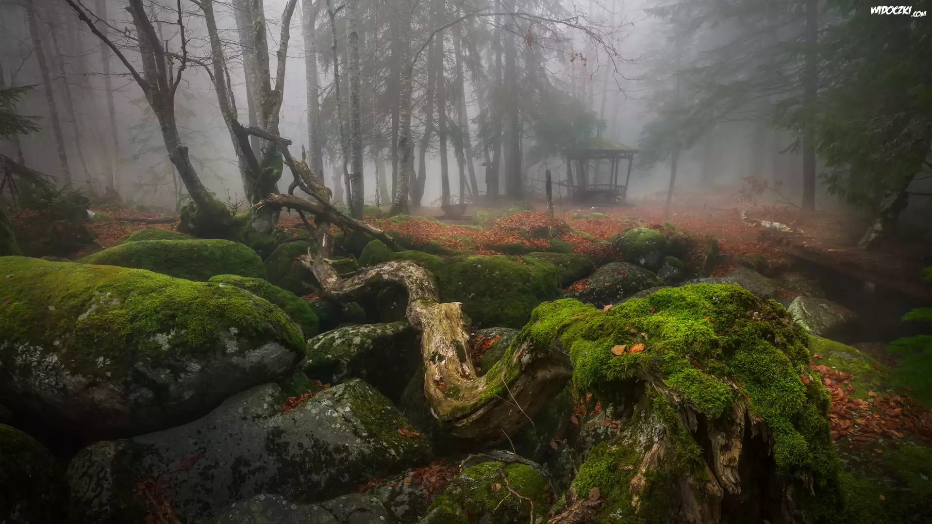 Zdjęcia, Park, Drzewa, Omszałe, Pnie, Kamienie, Altanka, Mgła