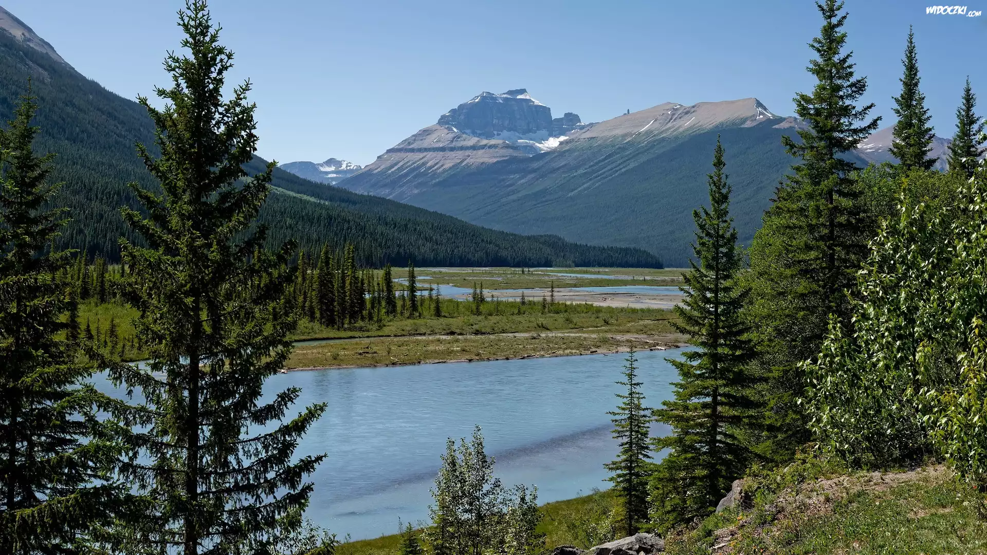 Zdjęcia, Góry, Canadian Rockies, Rzeka, Saskatchewan River, Drzewa, Park Narodowy Banff, Kanada